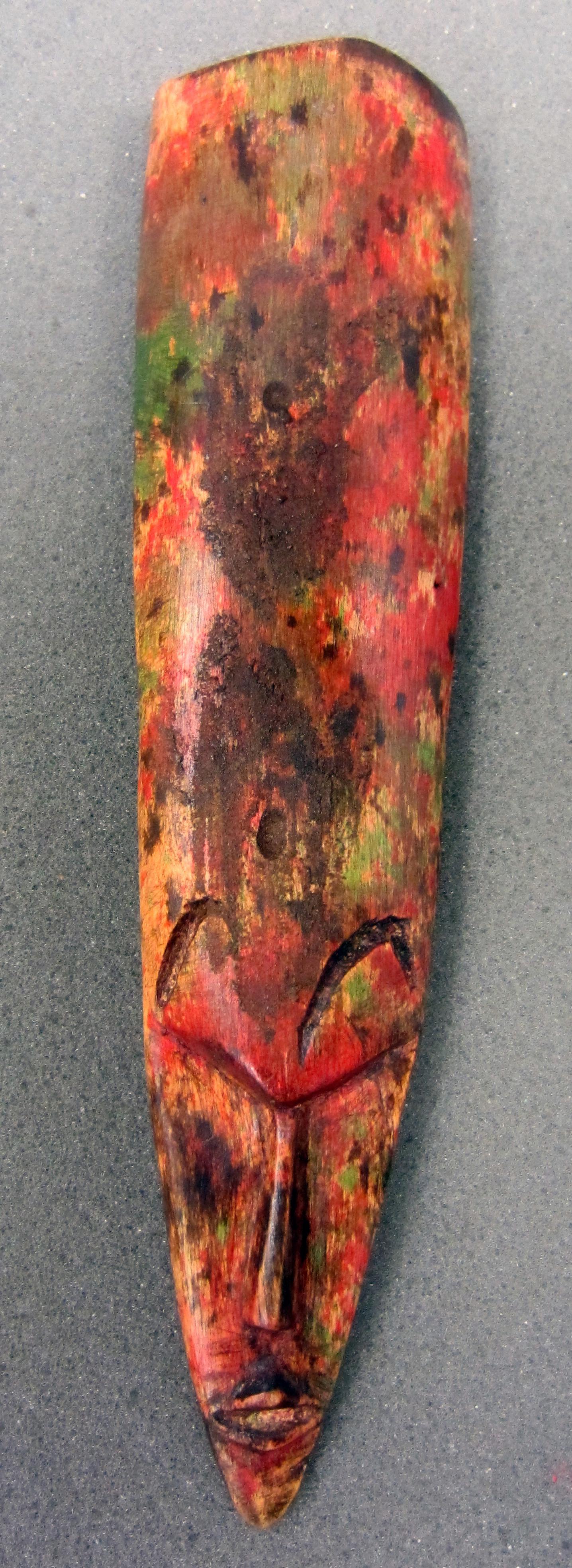 Carved wooden mask with a thin, pointed, elongated face. It is wider at the top than at the bottom, and the top is squared off. It is splattered with red, green, light brown and black paint.