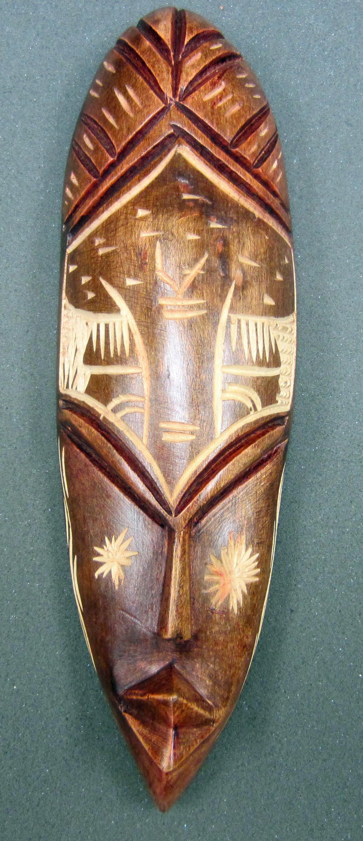 Carved wooden mask with carved symbols on top and different accents throughout. 27mm x 7mm x 3mm