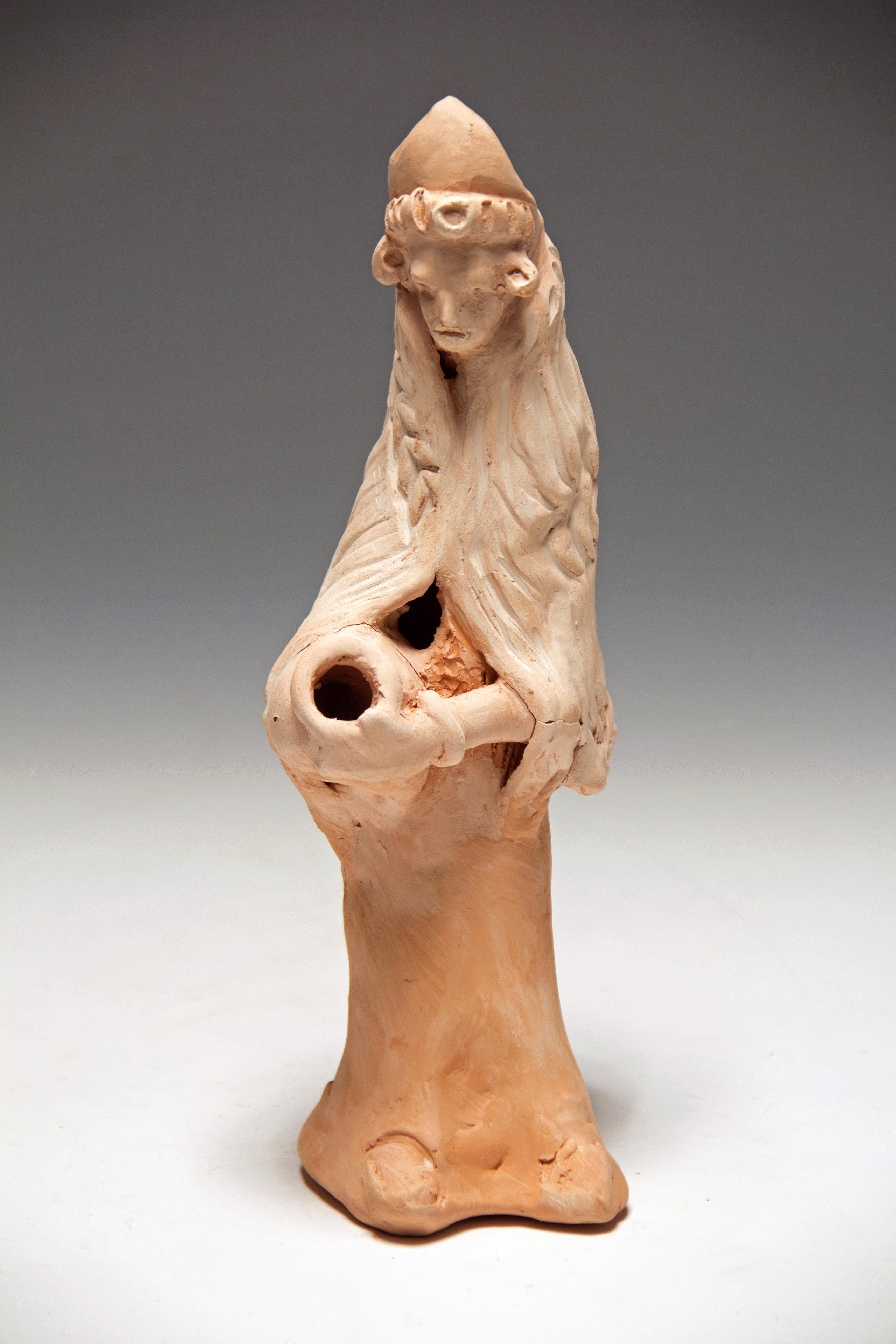 Red clay statue of a women in religious garb pouring a jug. 30.5 cm x 10.2 cm