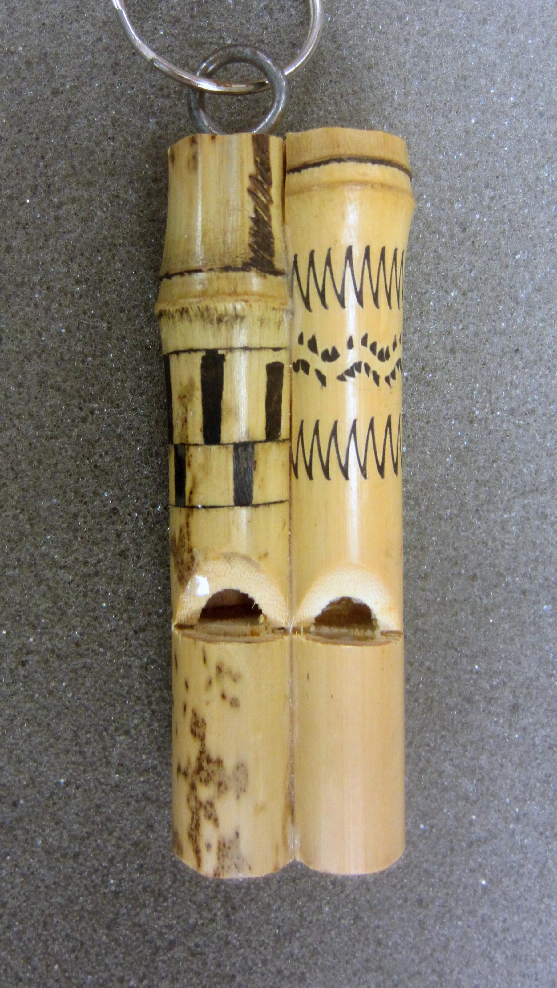 Two bamboo whistles glued together with different patterns on each. Metal keychain attached at the end. 4in x 1in