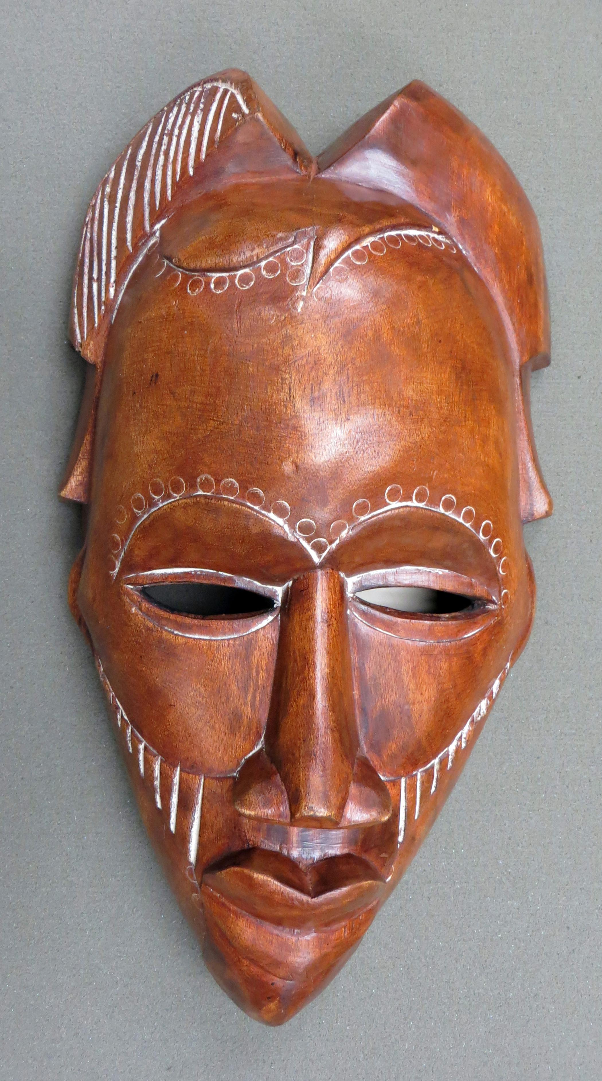A polished mask that is a face of a women, that is a dark brown color. 34cm x 23cm dia.