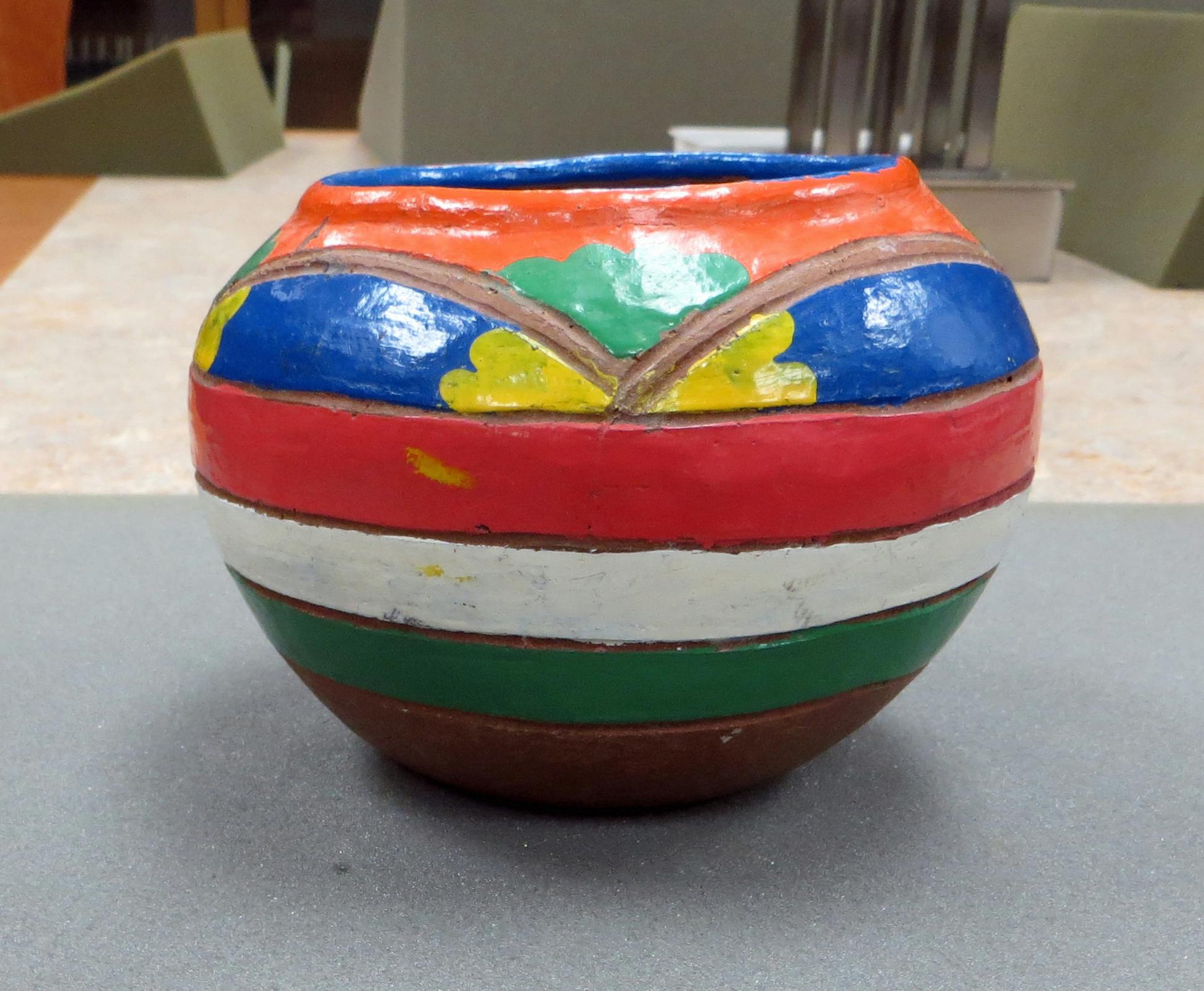 Small clay bowl. The rim is blue then background is orange , red, white, and green, brown. yellow and green flower pattern. (This bowl was also a gift from a national's home. It is traditionally used to drink home- made beer (beer is important in there culture) from, but can also serve as other purposes) 4inx5.5in