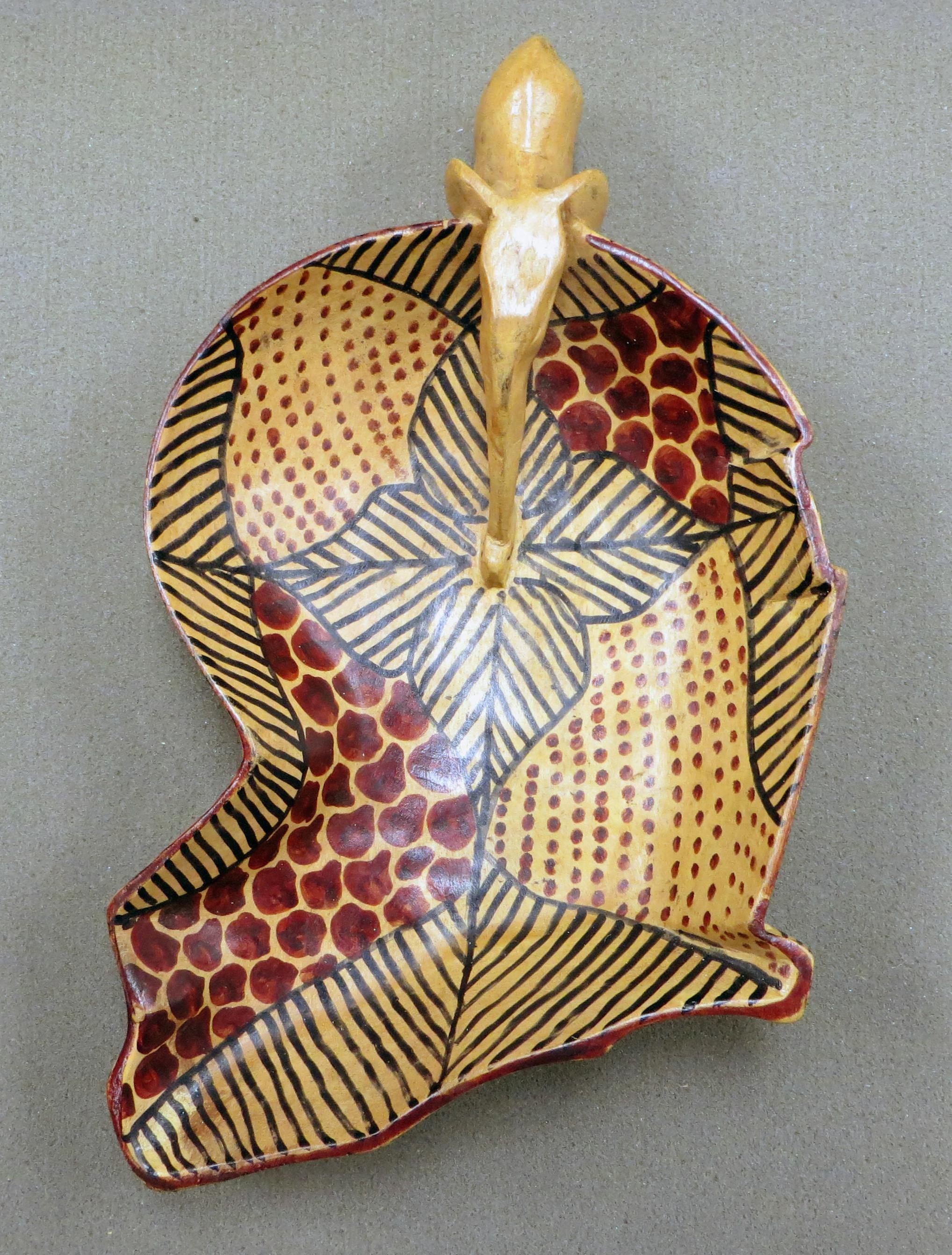 Has a tan elephant on the side maybe used for a handle, it is shaped as Africa, the inside of it looks like paintings of animal skin from zebras, cheetahs, and leopard print.