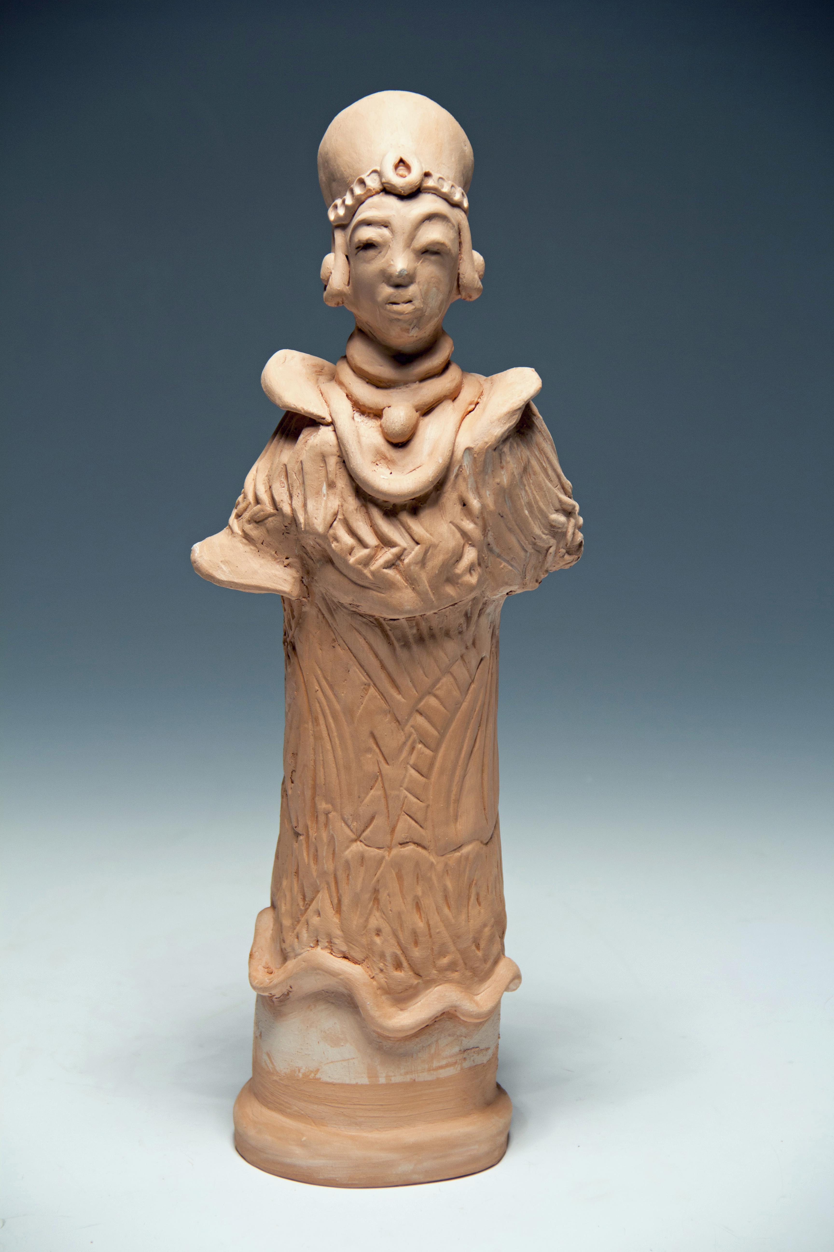 This statue seems to represent the Nok society artwork. The exaggerated clothing and jewelry being represented is particular to this group of people. Red clay. 31.37 cm x 15.24 cm