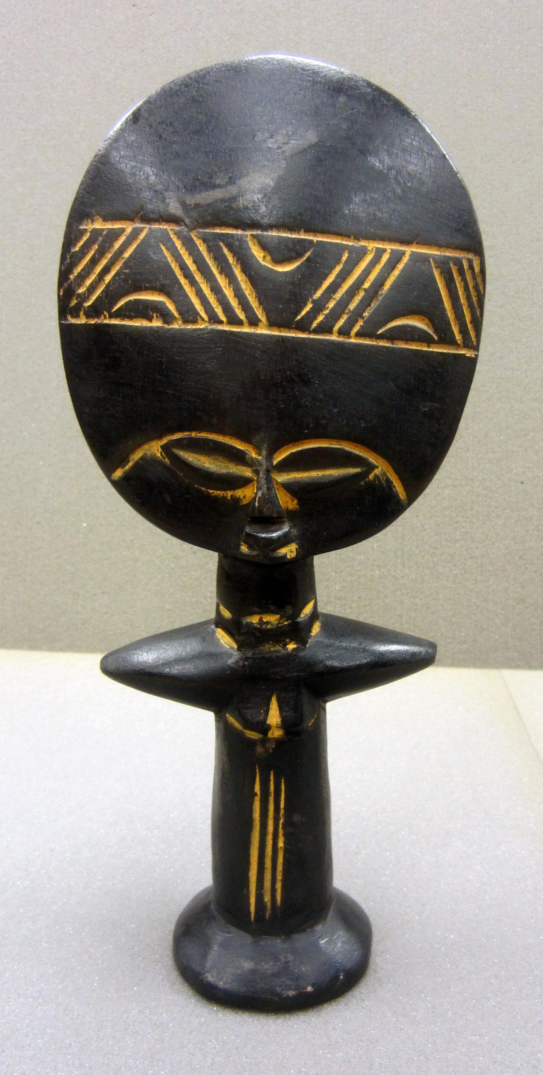 Carved, wooden representation of the Akua'ba fertility doll, painted black with yellow designs that outline the facial features; three vertical, yellow stripes on the lower body; two horizontal yellow lines on the forehead with a pattern of diagonal yellow lines in between them. The face of the doll is carved to reflect the Akan peoples' conception of beauty and what features are considered ideal. The head is flat so that it can easily be carried in a woman's clothes. Asante women who wanted to get pregnant would carry this doll in their back so that they could become fertile, and women who were already pregnant would carry it on their backs so that the child would be beautiful like the doll; they would dress, bathe, and care for the doll as if it was a real child. Once the child is born, the doll is given to her as a toy to teach her how to care for a baby. The name "Akua'ba" means "Akua's child," and Akua is the woman who first had one of these dolls carved to help her conceive, and she started the tradition. 26.5cmX10.5cm