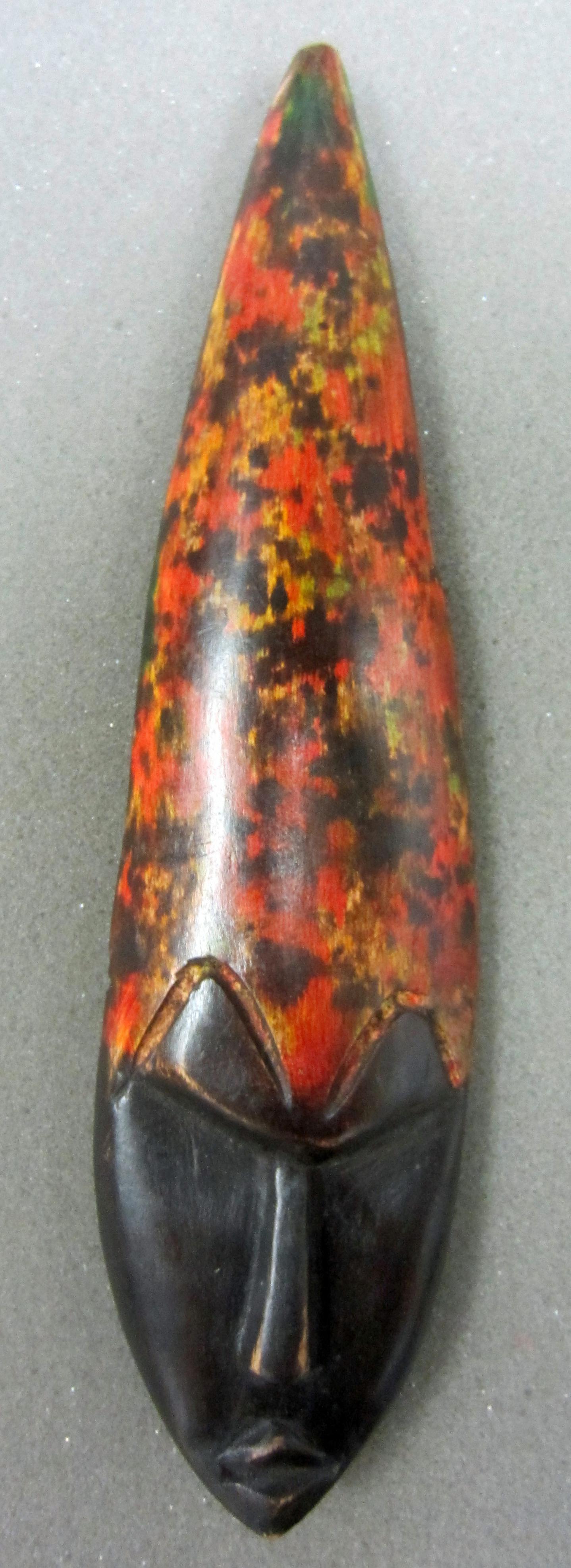 Carved wooden mask with a rounded face and a thin, cone-shaped head. Painted black with red, green, and light brown paint splattered on the forehead. In ancient Ghana, masks were made to represent spirits of animals, ancestors, mythological heroes, or a way to honor someone in a symbolic way. The maker of the mask was usually of higher rank since they were believed to have a closer connections to the spirits and the spirit world. Masks were used during spiritual ceremonies, but were also used as decoration and were seen as a 'protector' of the home. 22.5cmX5.75cm.
