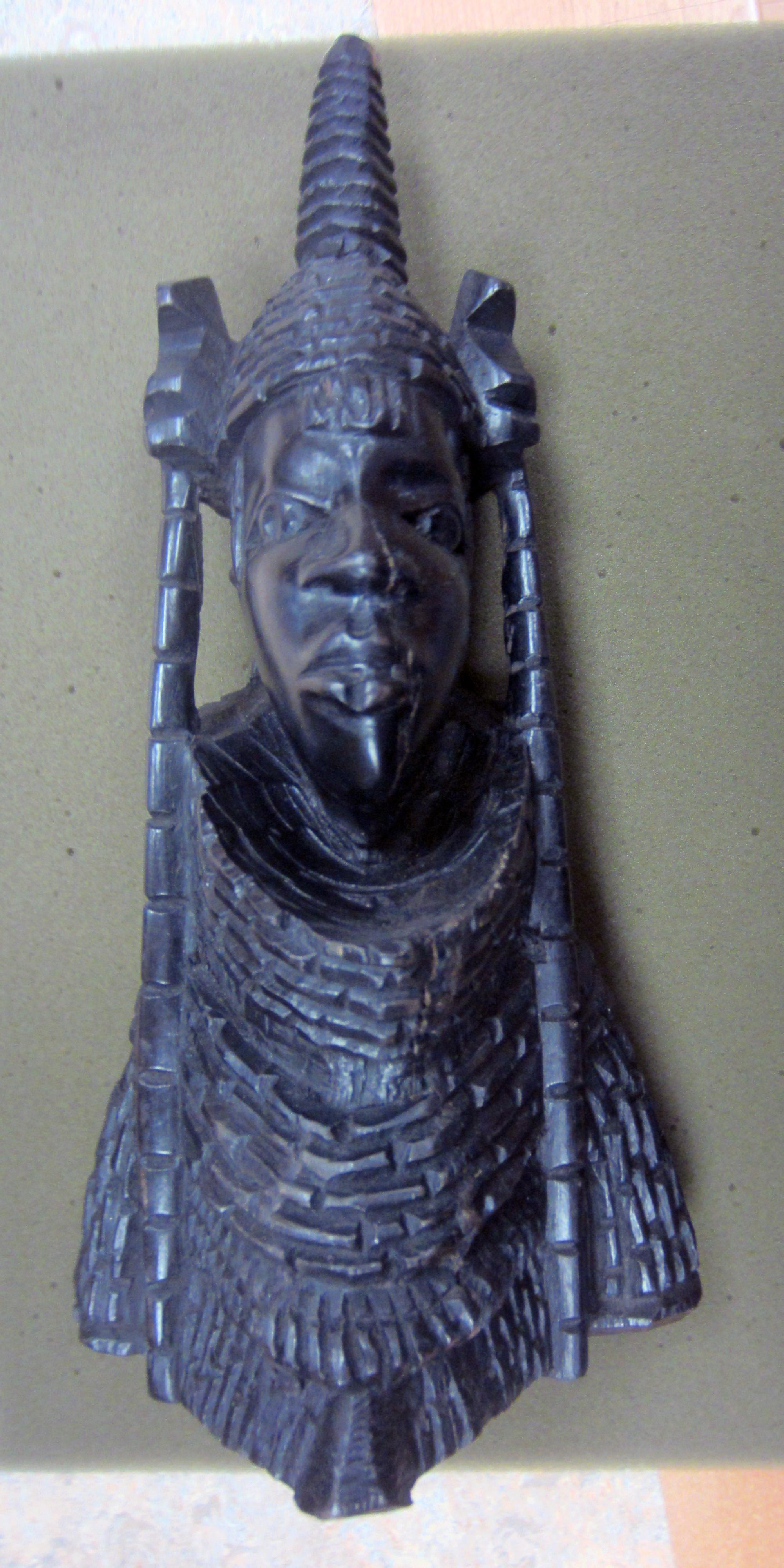 Heavy black wood sculpture of woman with headdress. Non-Hollow. Carved. 12"X4"6"
