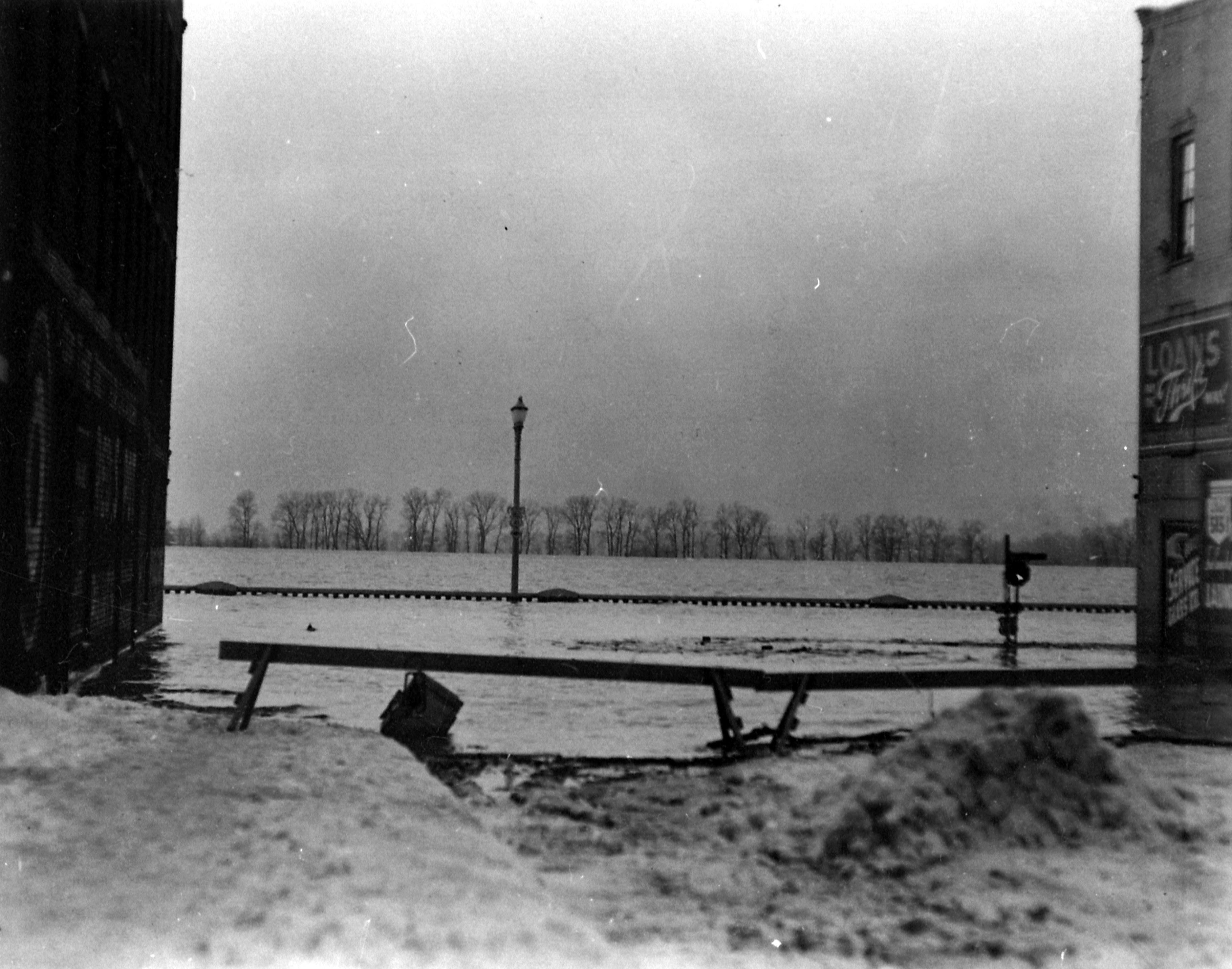Dress Plaza, looking from behind and between 2 buildings toward river. Snow in foreground. Building on right contains advertisement for Thrifty Loans