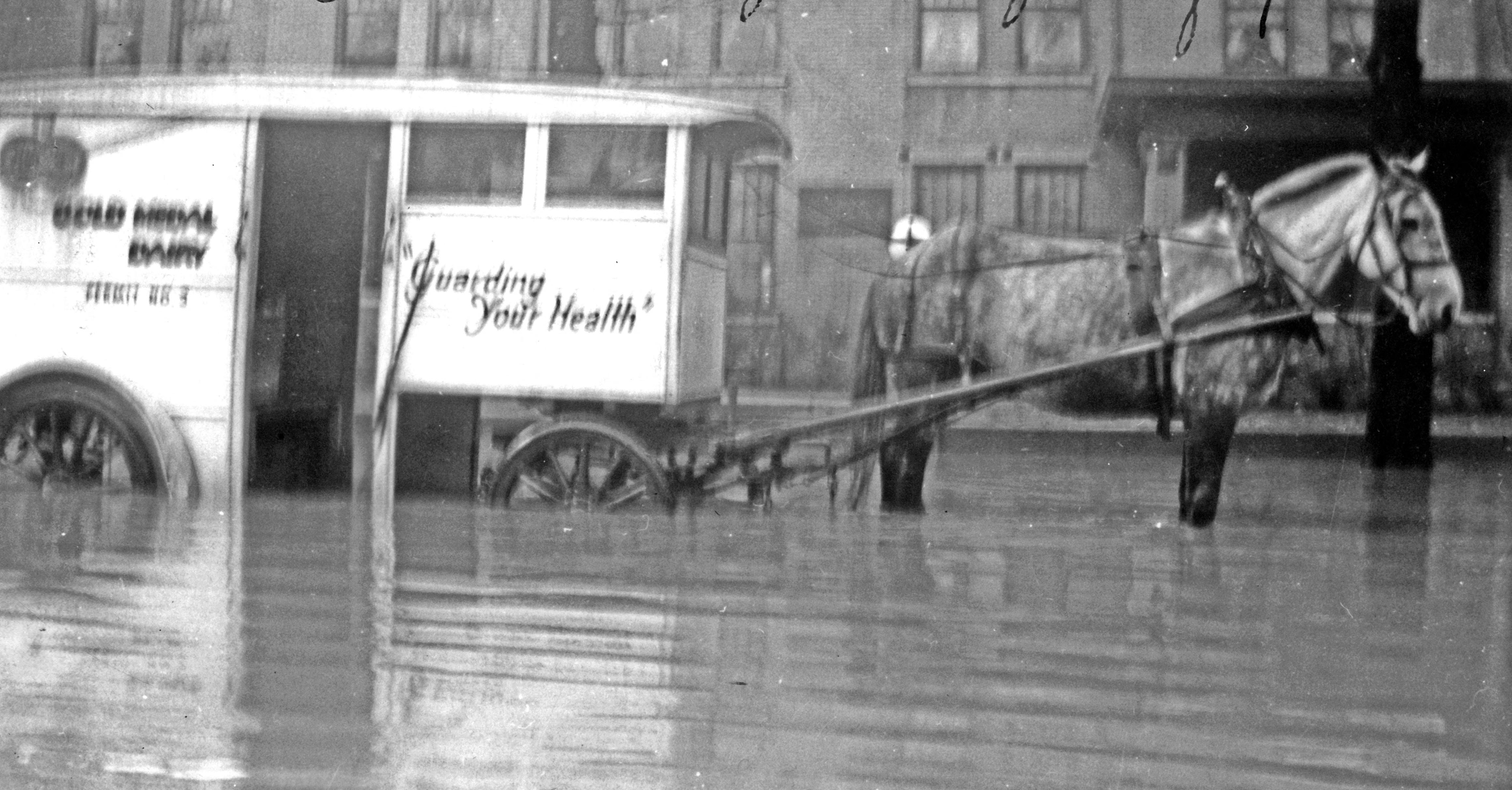Horse drawn delivery truck for Gold Medal Dairy Co. Inc. in front of apartment building. Dairy itself (not shown) located at 601 Division St., near intersection with Garvin St. Photo credited to Mr. Pierce - milkman (possibly Areal B. Pearce, who the 1937 Evansville City Directory lists as a salesman for Gold Medal Dairy)