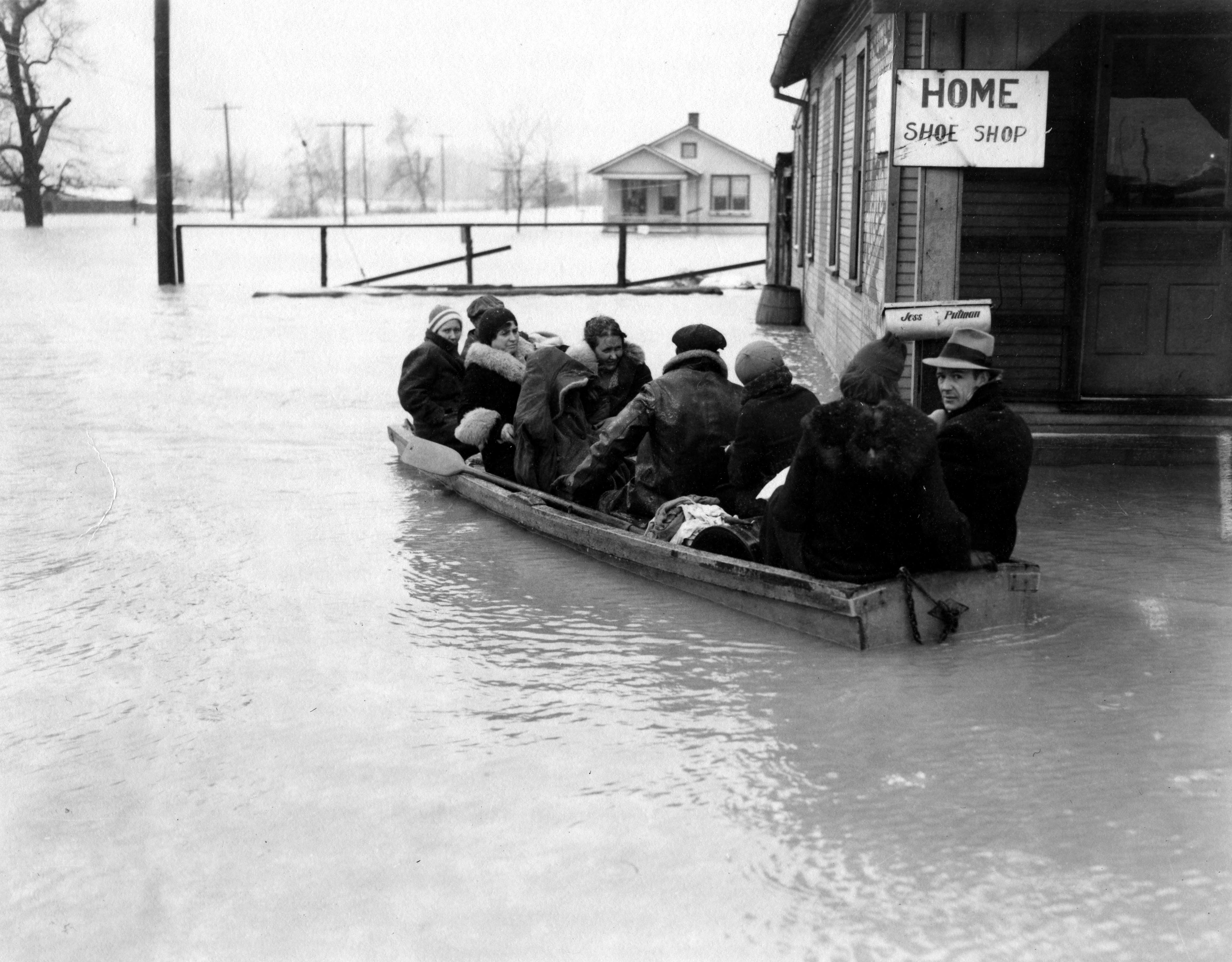 Rowboat crowded with 8 people in front of shoe repair shop owned by Jesse Putnam at 1167 or 1169 (city directory varies) E. Riverside Dr., at corner with Gilbert Ave.