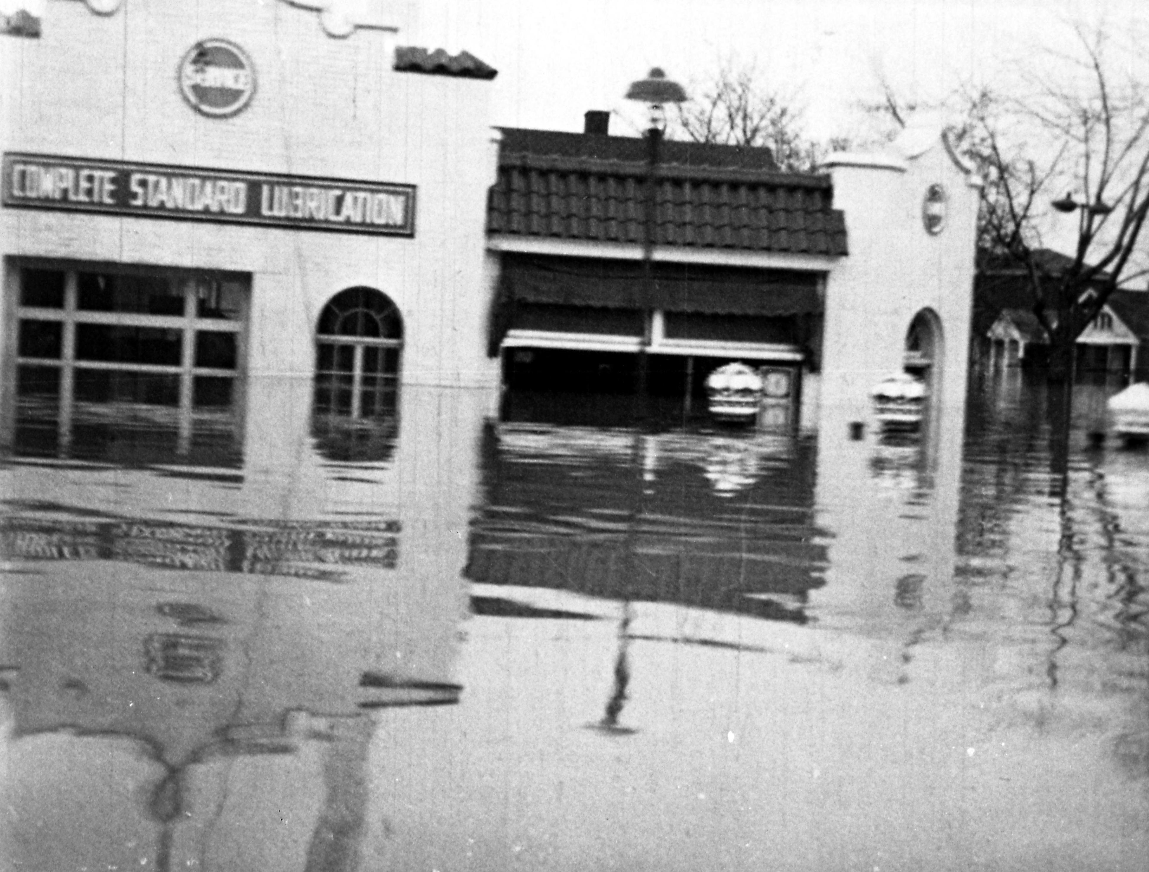 Standard Service Station at 968 S. Kentucky Ave., on corner of Washington Ave. Water is halfway up windows under Complete Standard Lubrication sign.