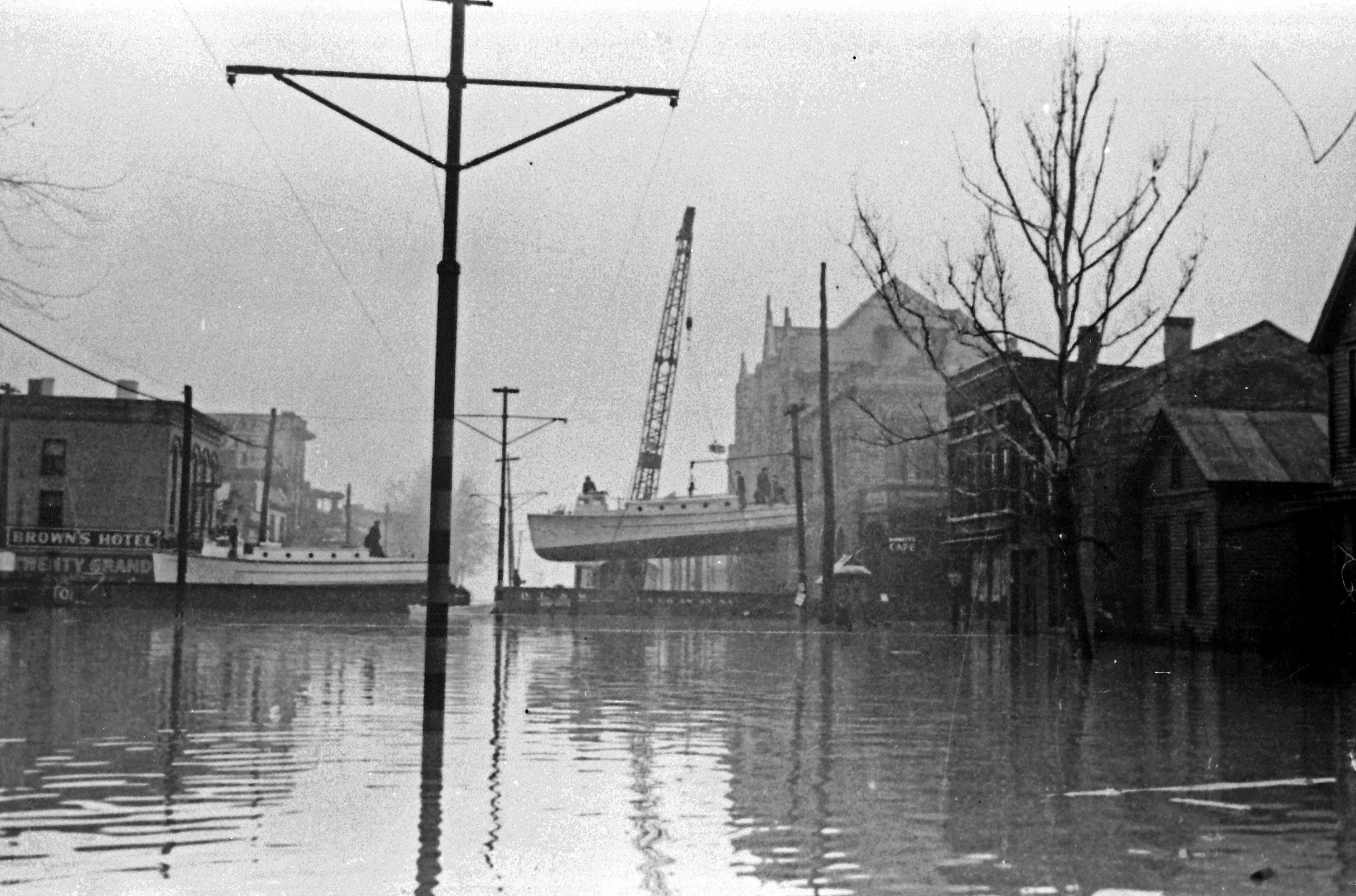 Two rescue boats, one being unloaded by crane, on 300 block of Fulton Ave., with L & N Railroad Depot at 300 Fulton Ave., on right in background and Brown Hotel and Restaurant at 313 Fulton Ave. on left.