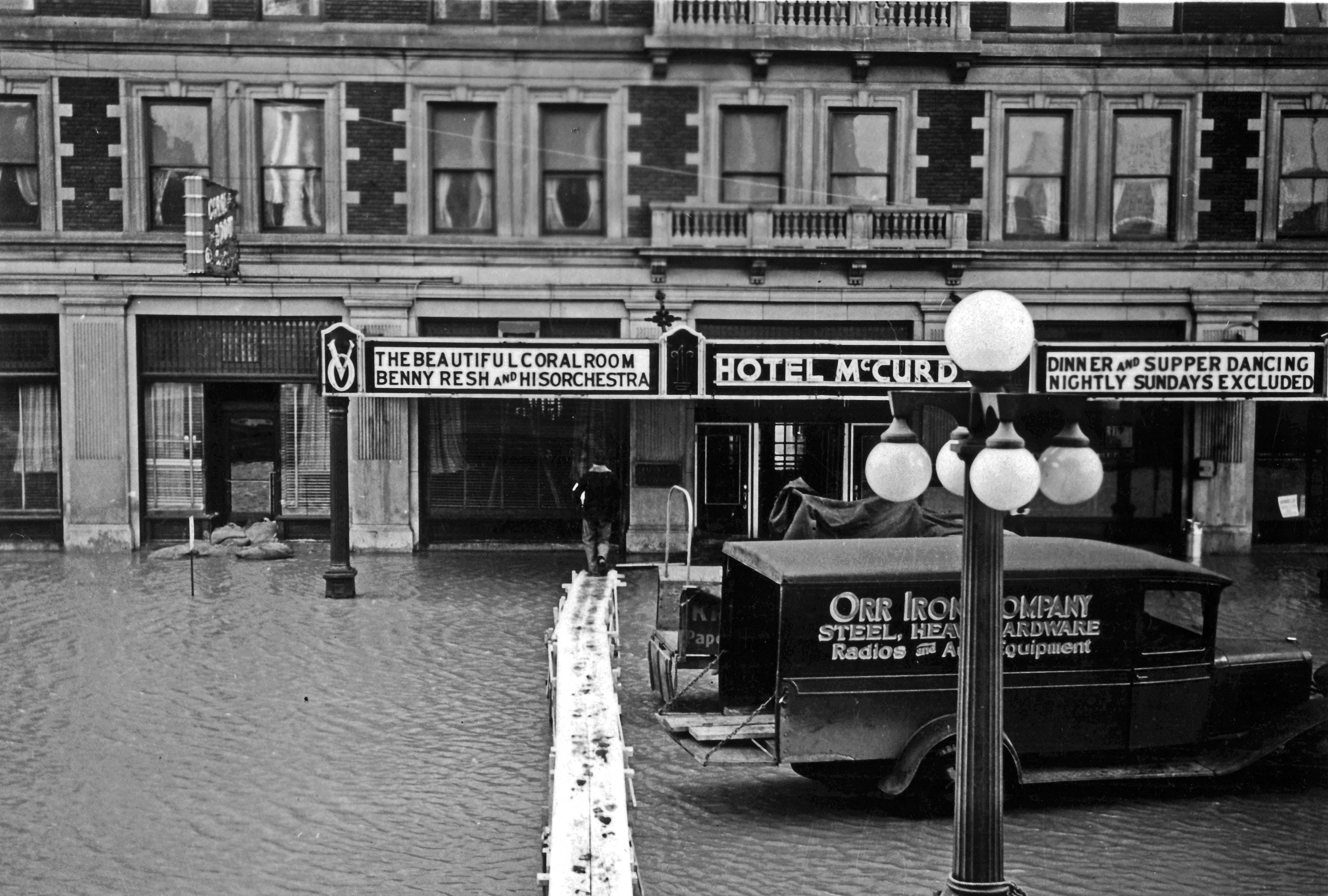 Catwalk to Hotel McCurdy at 101-11 SE 1st St.. Hotel advertising Benny Resh and his orchestra in the Coral Room. Orr Iron Co. delivery truck in front.