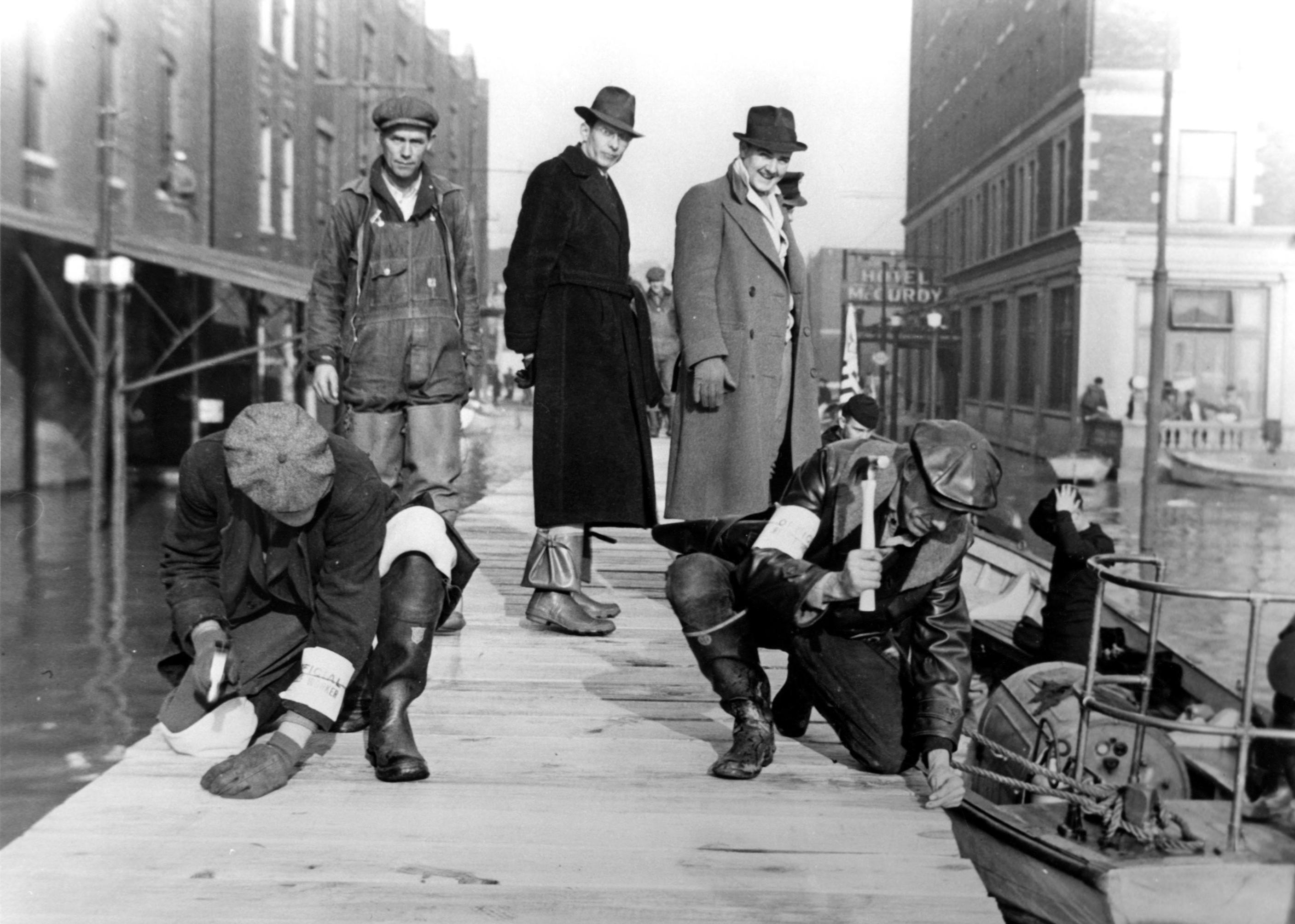W.P.A. workers hammering catwalk/runway to loading dock on Locust St. between the Hotel McCurdy (right) at 101-11 SE 1st St. and Keller Crescent (left ) at 24-28 SE Riverside Dr. with three men behind them. Workers have armband identifying them as Official Workers.