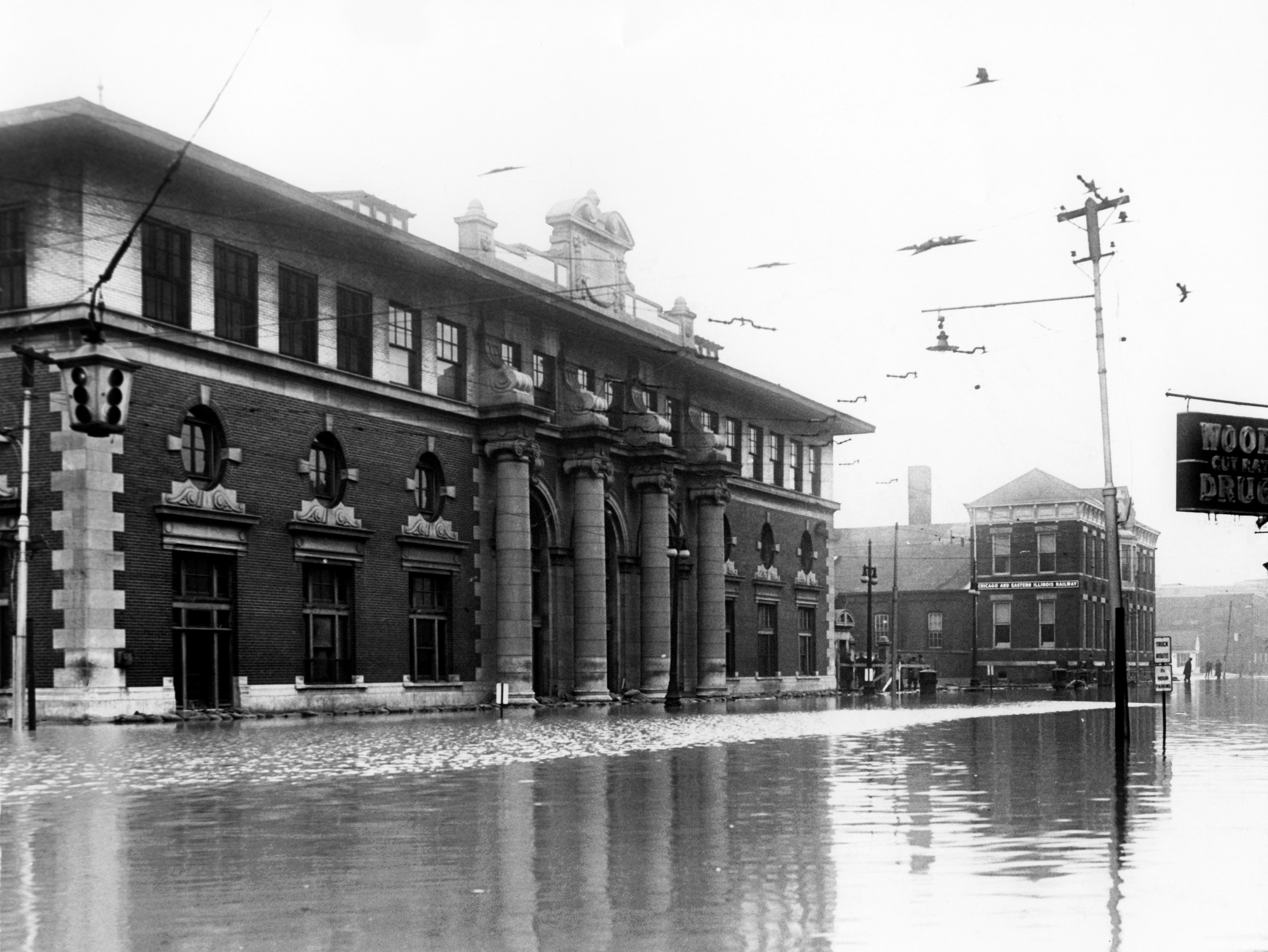 Chicago and Eastern Illinois Railroad passenger depot at 28 SE 8th St., with water covering street and surely in building. H.A. Woods Drug Co. (probably the one at 729 Main St.) sign on right. (Side note: when this building was razed, the columns pictured here were repurposed into a Four Freedoms monument on the riverfront.) Freight depot is building in rear.