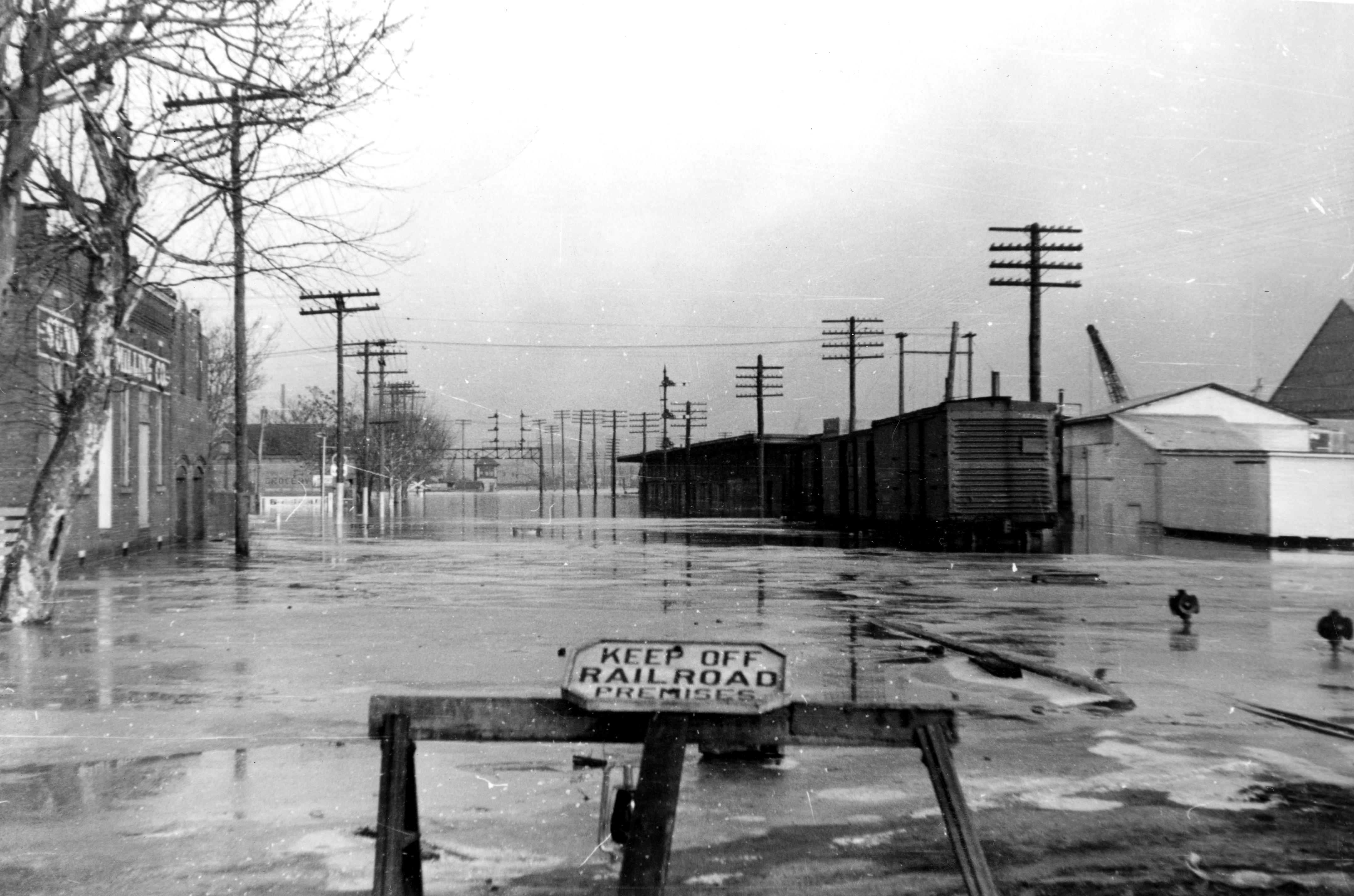 Building on left believed to be Stovall Lumber Co. at 1145 Adams Ave. If this location is correct, then the grocery beyond the milling co. could be Veillard Brothers Grocery at 1019 Henning Ave. Railroad tracks and cars on left, with sign: Keep Off Railroad Premises in foreground