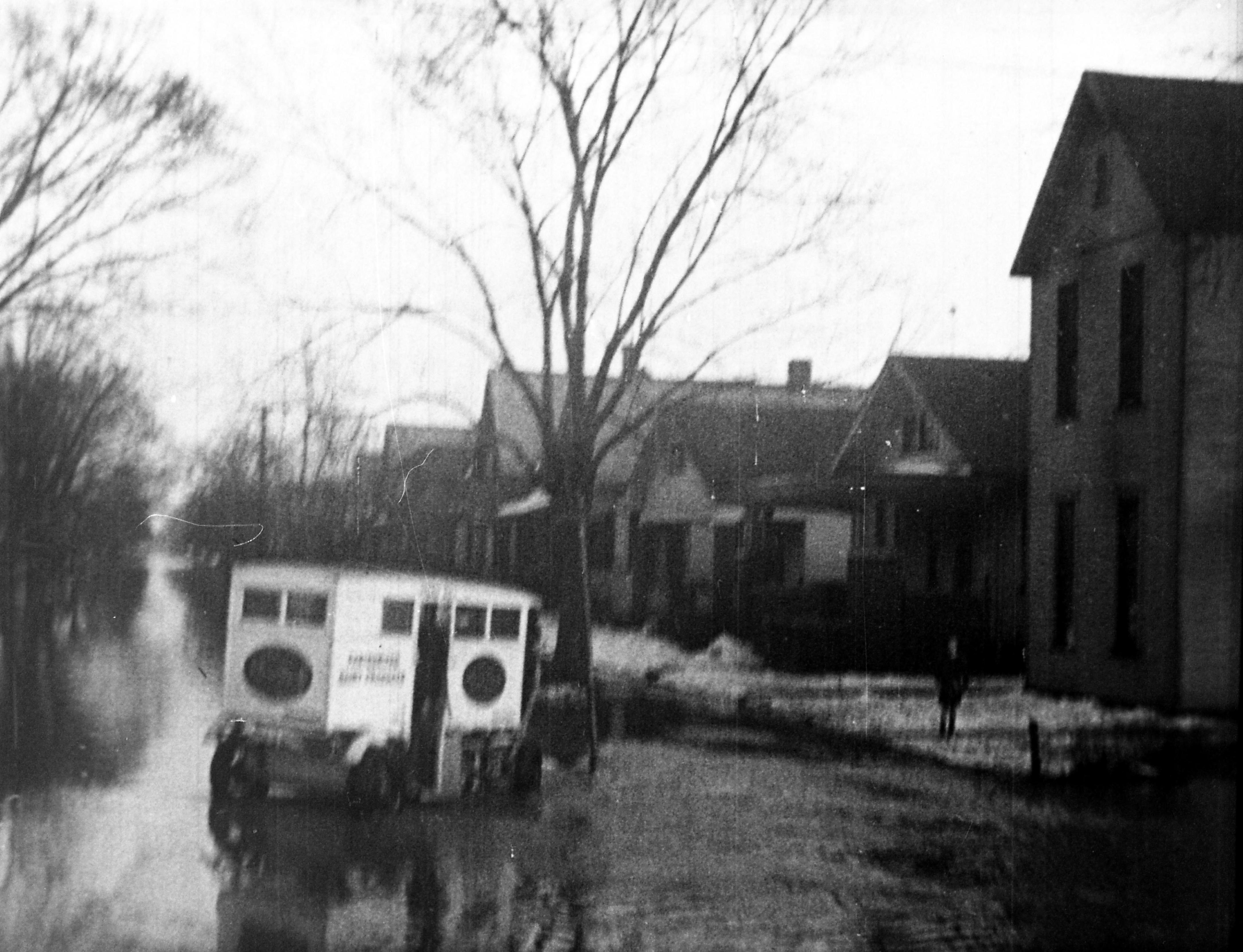Delivery truck (probably a dairy truck, delivering water) in residential area, with water just over curbs. Person standing in front of house. Snow visible on yards. May be on Washington Ave.