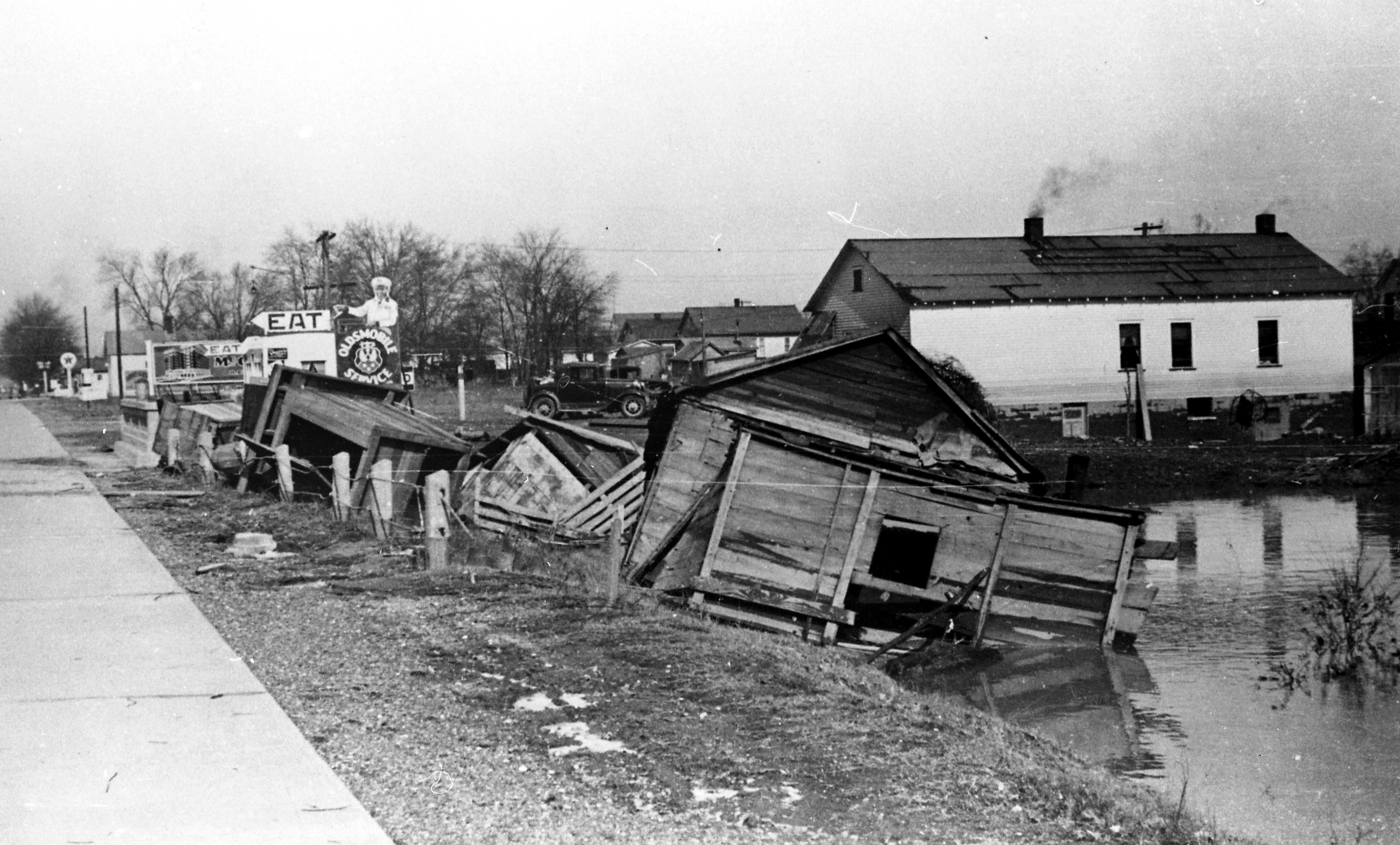 Toppled/destroyed house. Next to this are billboards advertising Oldsmobile service and someplace to eat; Texaco filling station in background on left.