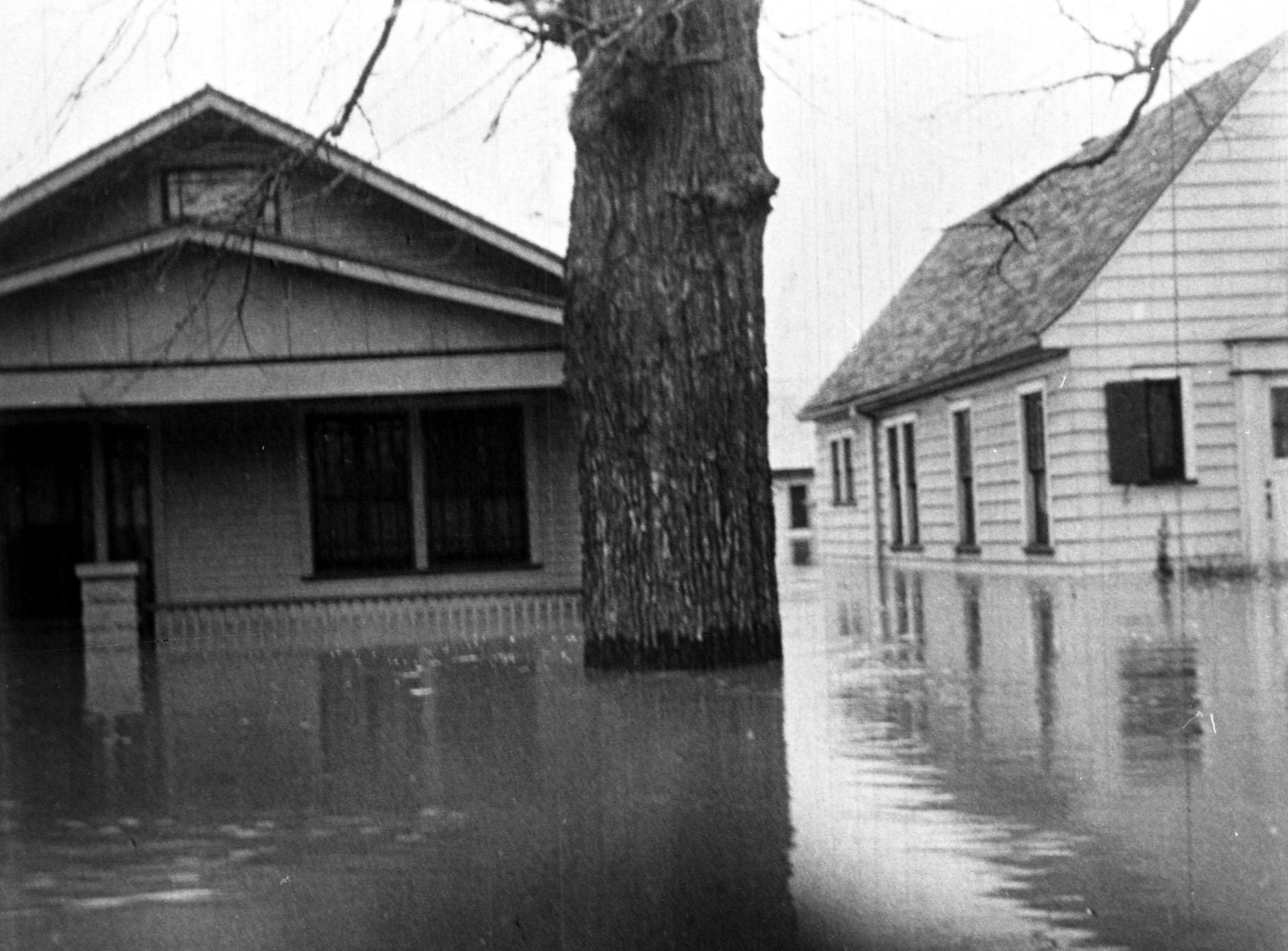 Two frame houses with water up to bottom of windows/over porch. View is between houses with large tree in front of house on left.