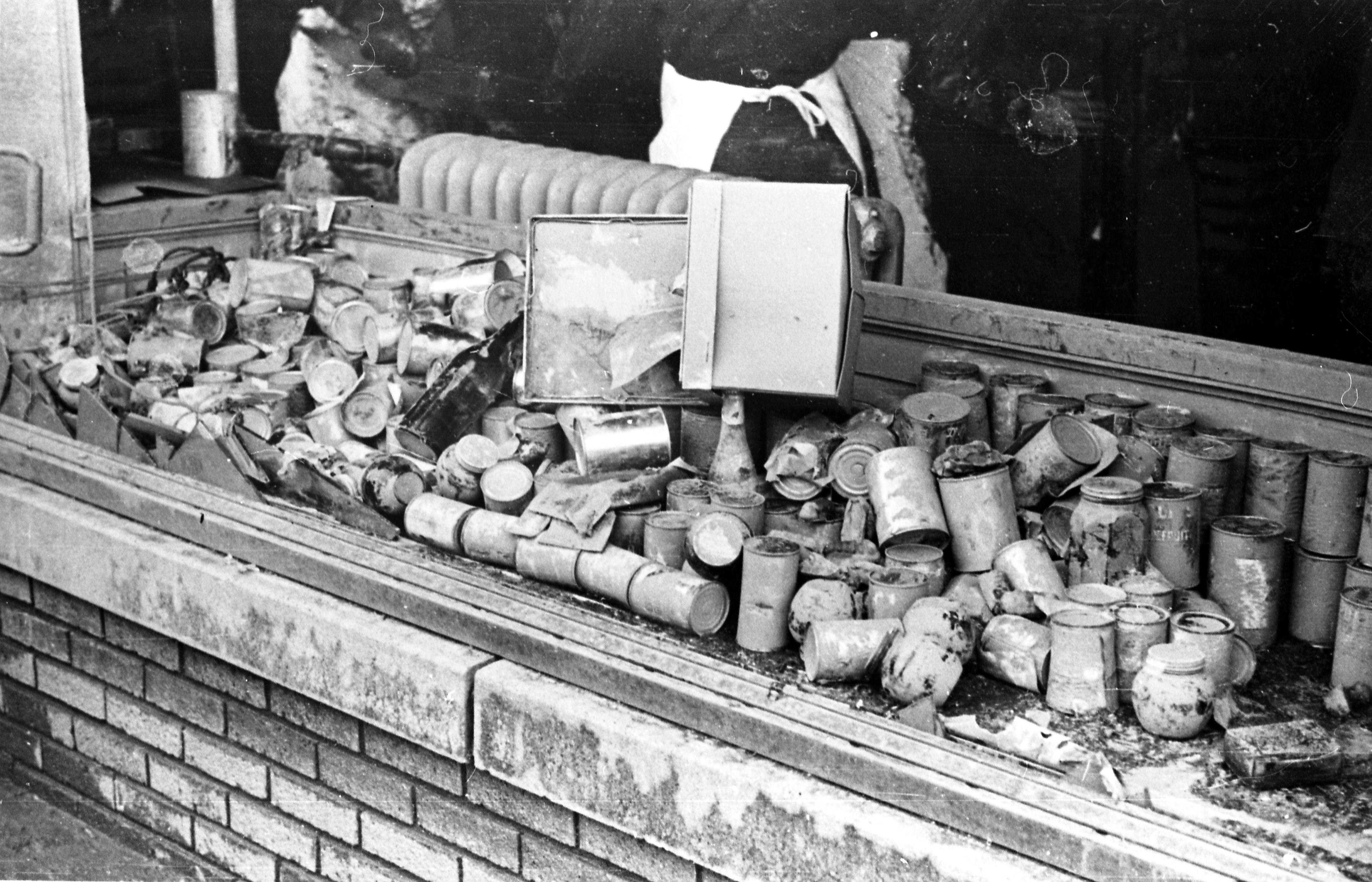 Broken window of Nicholson Brothers grocery, 1010 S. Kentucky Ave., with ruined canned goods in sill and radiator beyond.