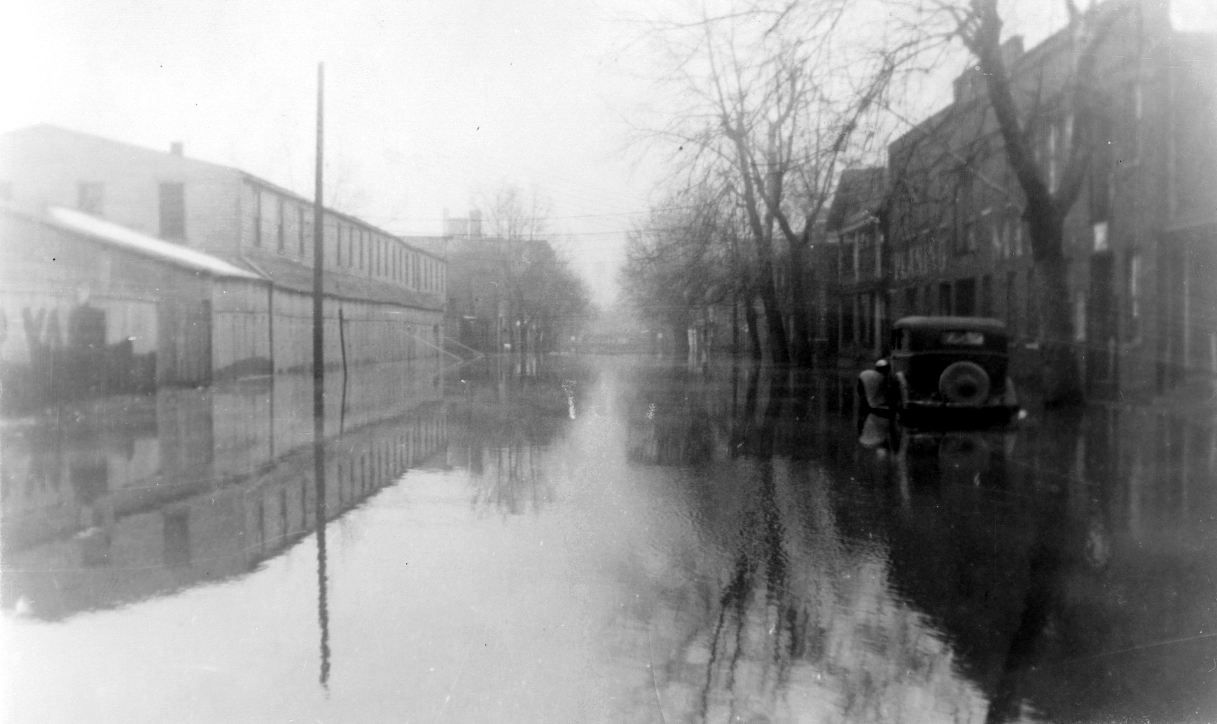 Looking down flooded commercial street, with what might be warehouses on left and possibly Rechtin Lumber Co. planing mill at 714-20 Ingle St. on right. Car sits in fairly low water