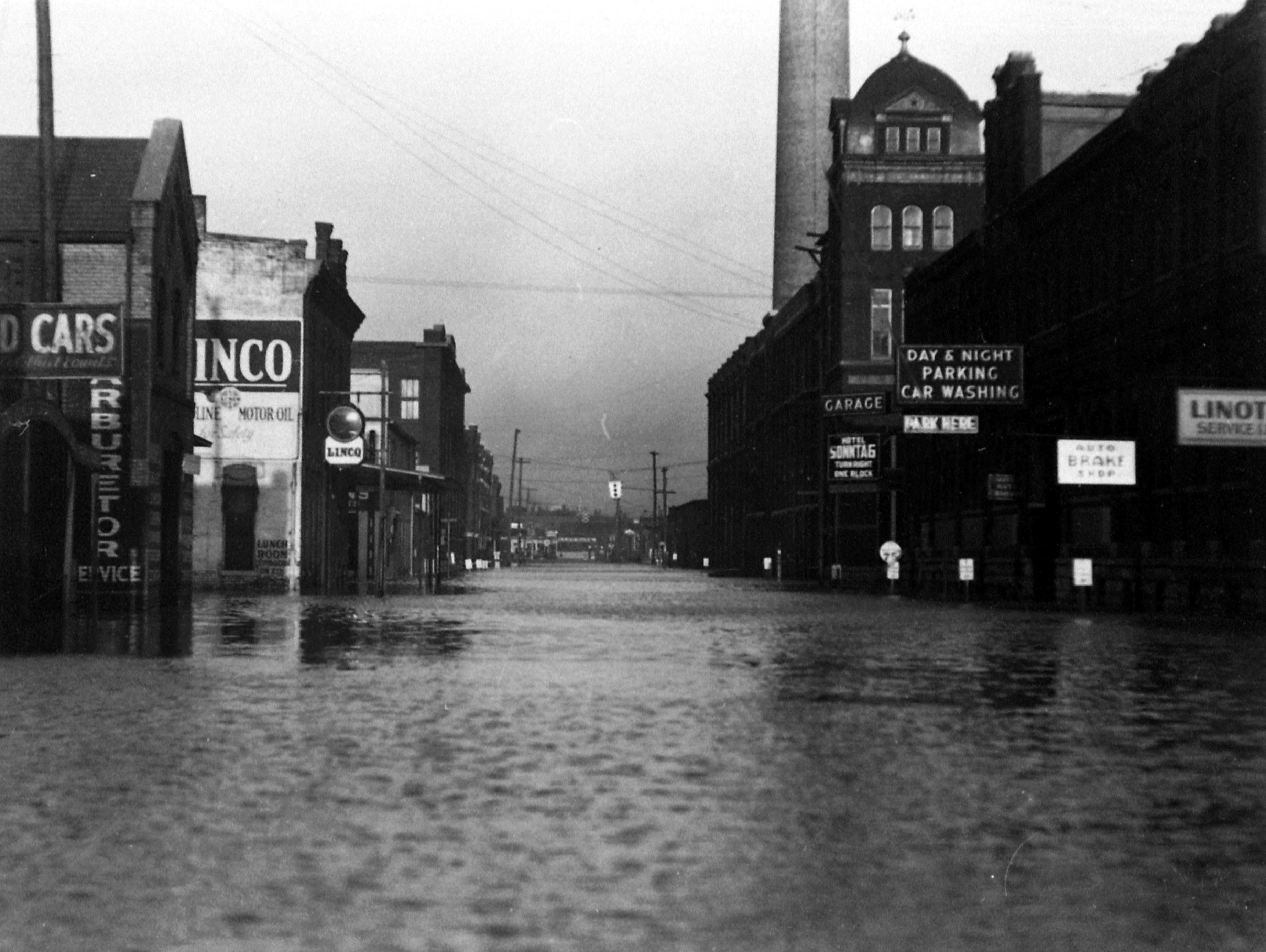 Flooded first block of NW 7th St. Advertisements on buildings for used cars, carburetor service, Linco Oil, parking garages, linotype service, but no specific businesses can be identified. Sign for Hotel Sonntag says turn right one block. Tower in front of smokestack probably F.W. Cook Brewing Co. at 11 NW 7th St.