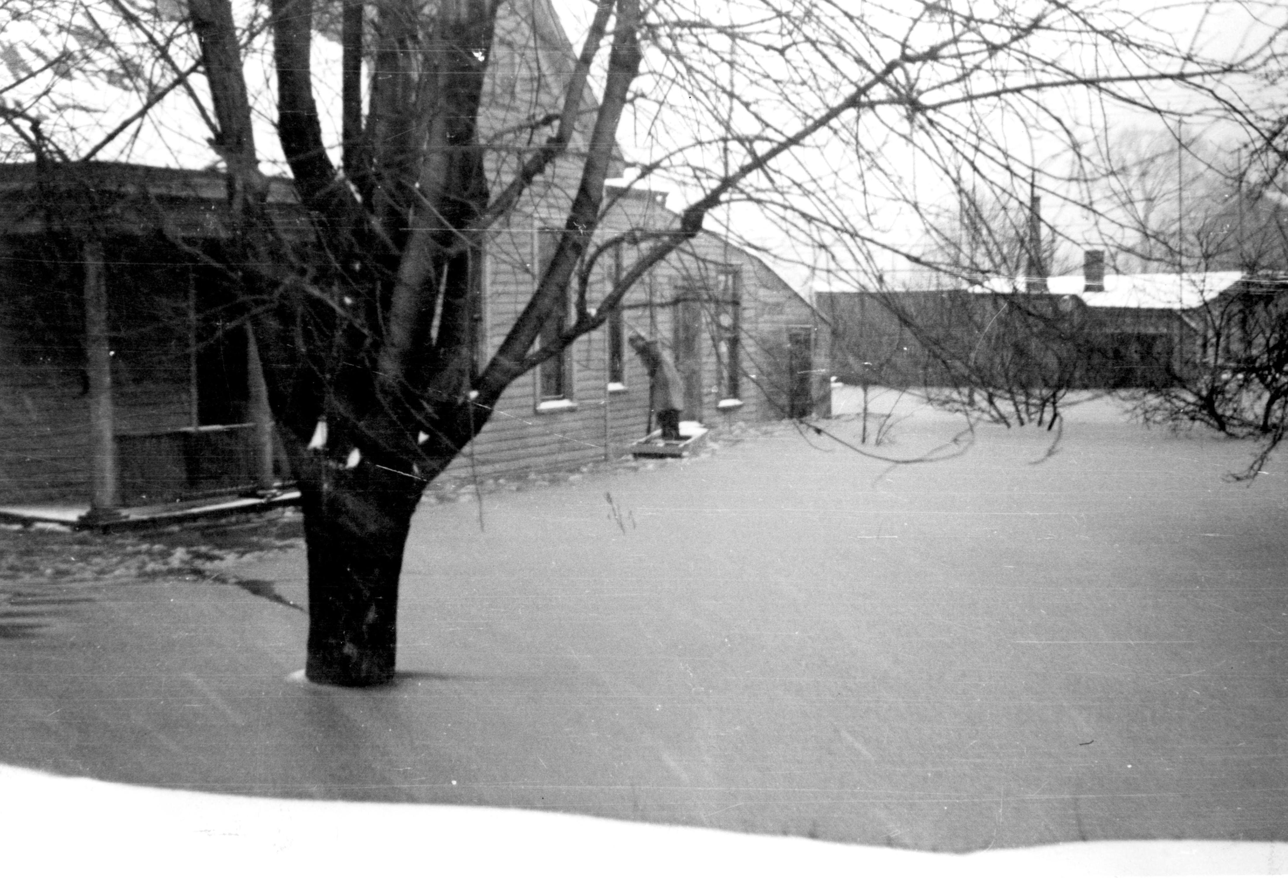 Person standing in boat right next to house in small channel of open water. The rest of the area is ice/snow covered.