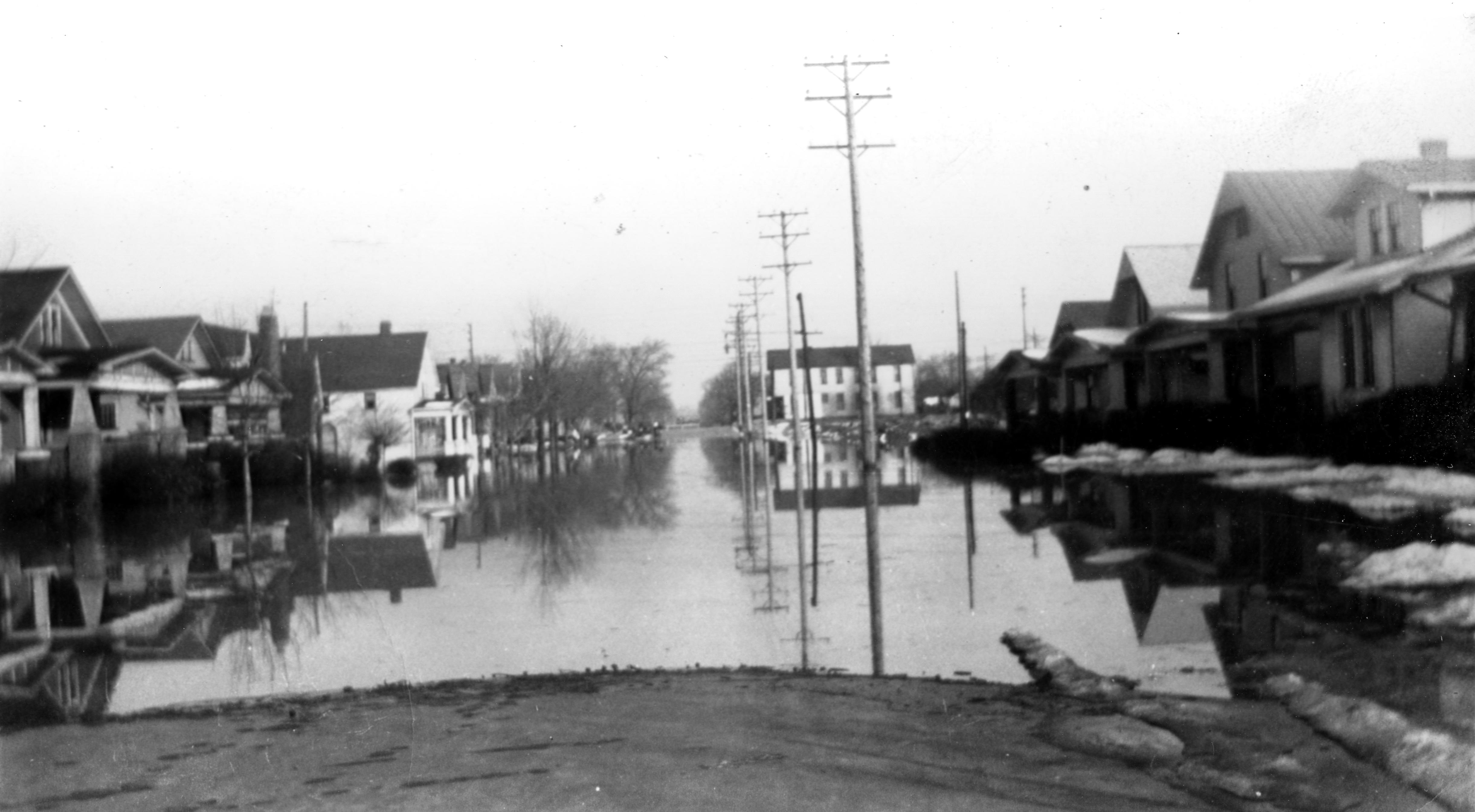 Unidentified blocks of Pennsylvania St. with water partially covering street and possibly up to/in some houses