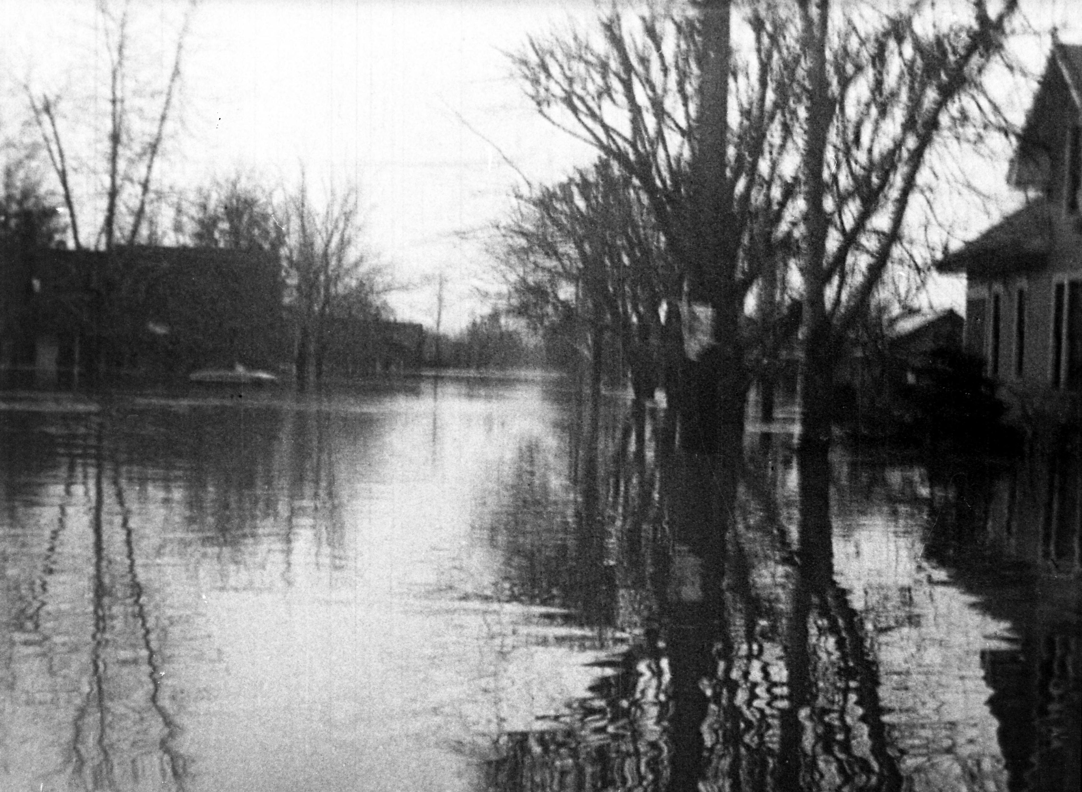 Flooded street in residential area with fairly high water. May be a boat visible in left middle ground.
