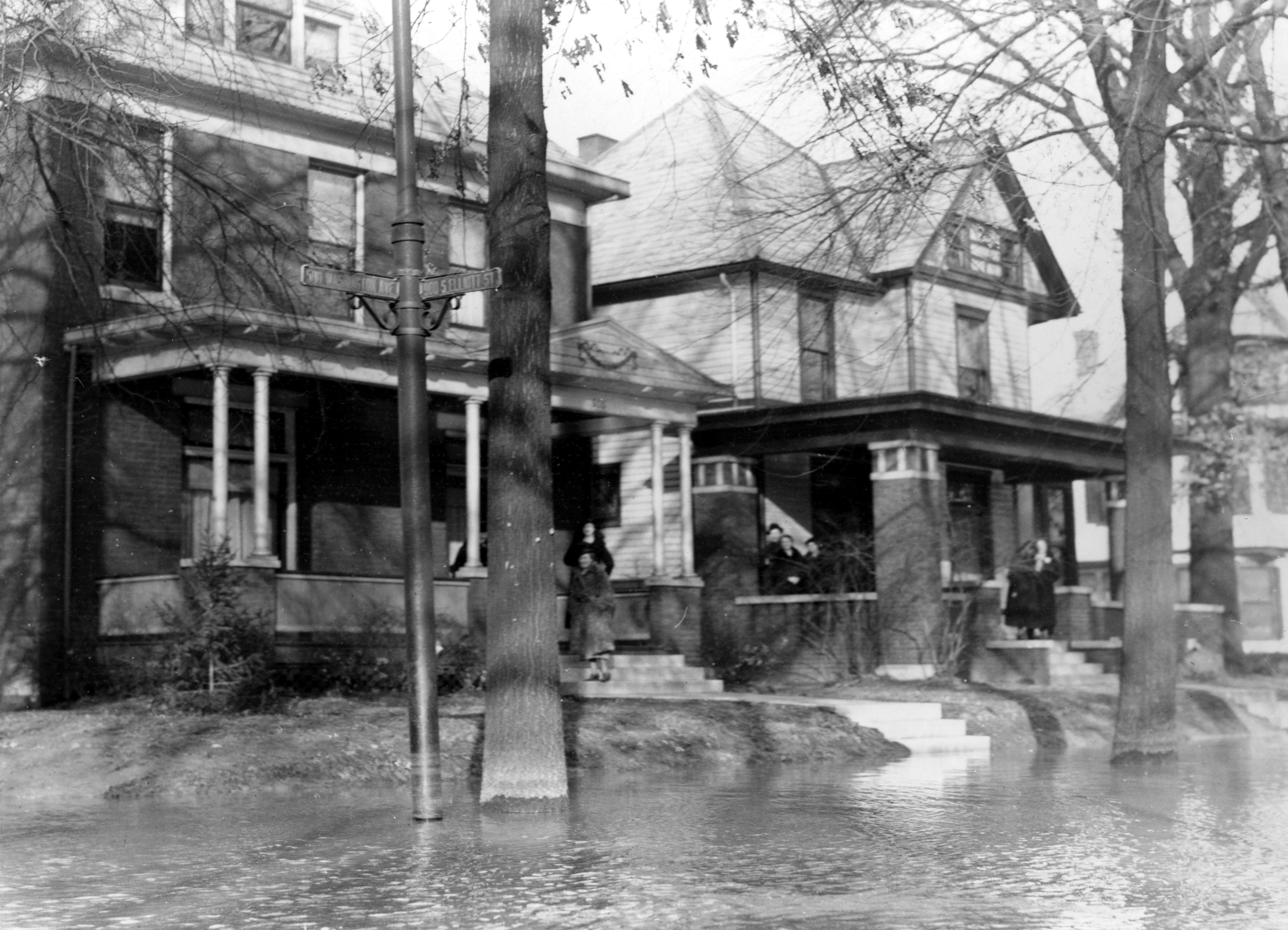 Two houses, with people on porches, on Washington Ave. just past the intersection with S. Elliott St. Water is over the street but not in the yards or houses. House on left possibly at 500 Washington Ave., owned by Harold C. Heseman.