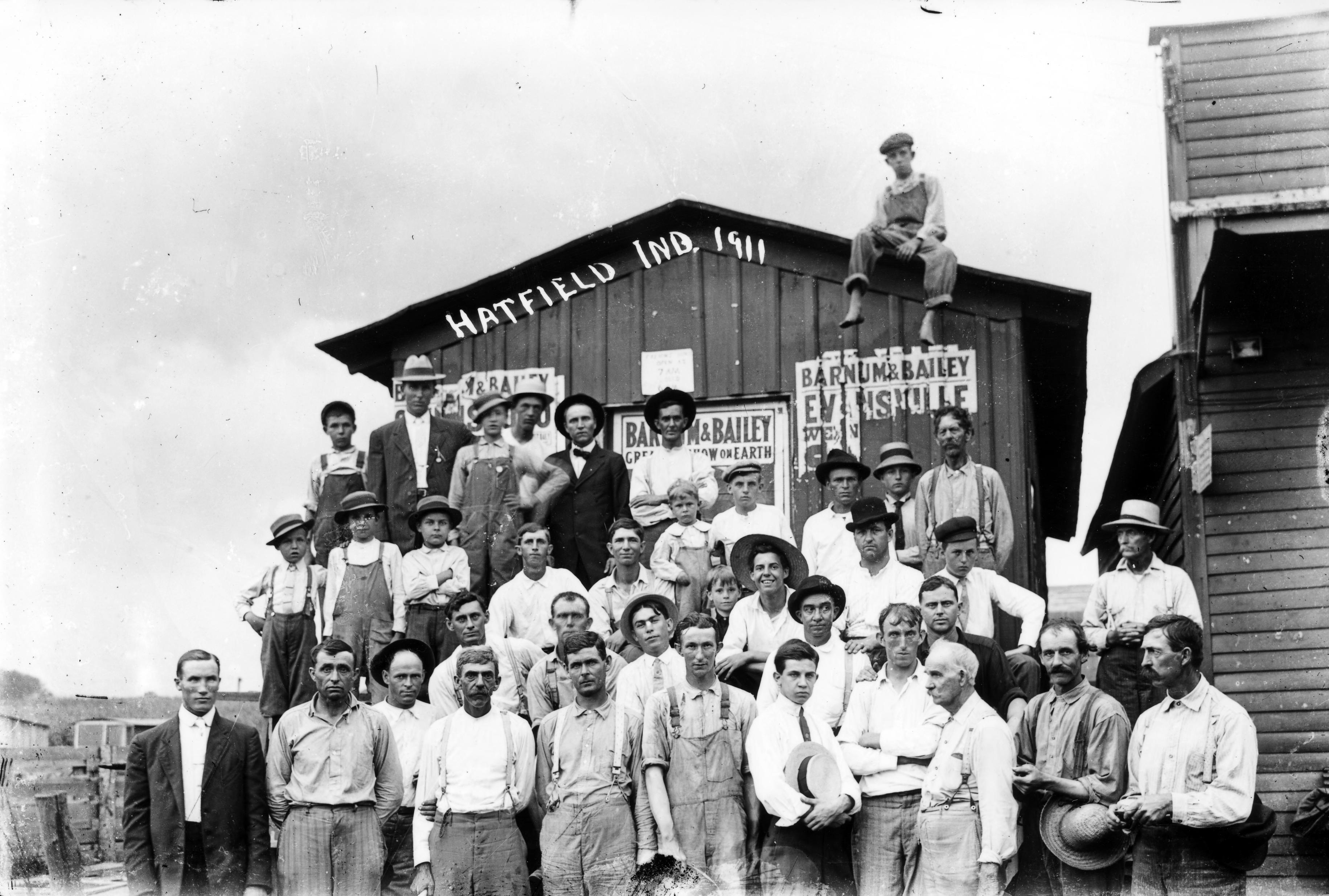 Large group of men and standing in front of a building advertising an upcoming performance of the Barnum & Bailey Circus in Evansville. One boy sits on the roof of the building. Hatfield, IN is in Spencer County, IN and had a population of 813 in the 2010 census.