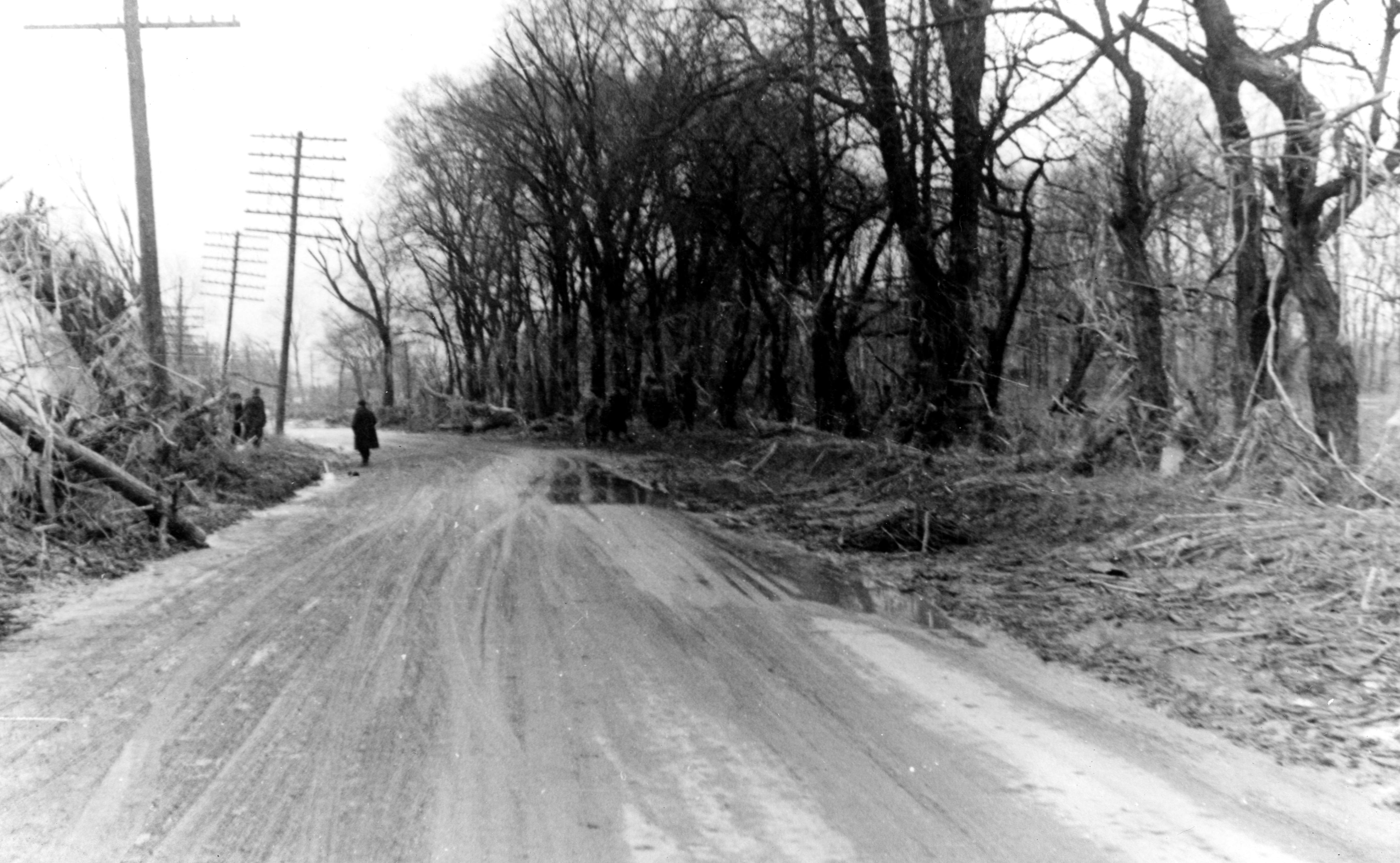 Unidentified road, with people looking at crooked power poles and natural debris left from flooding