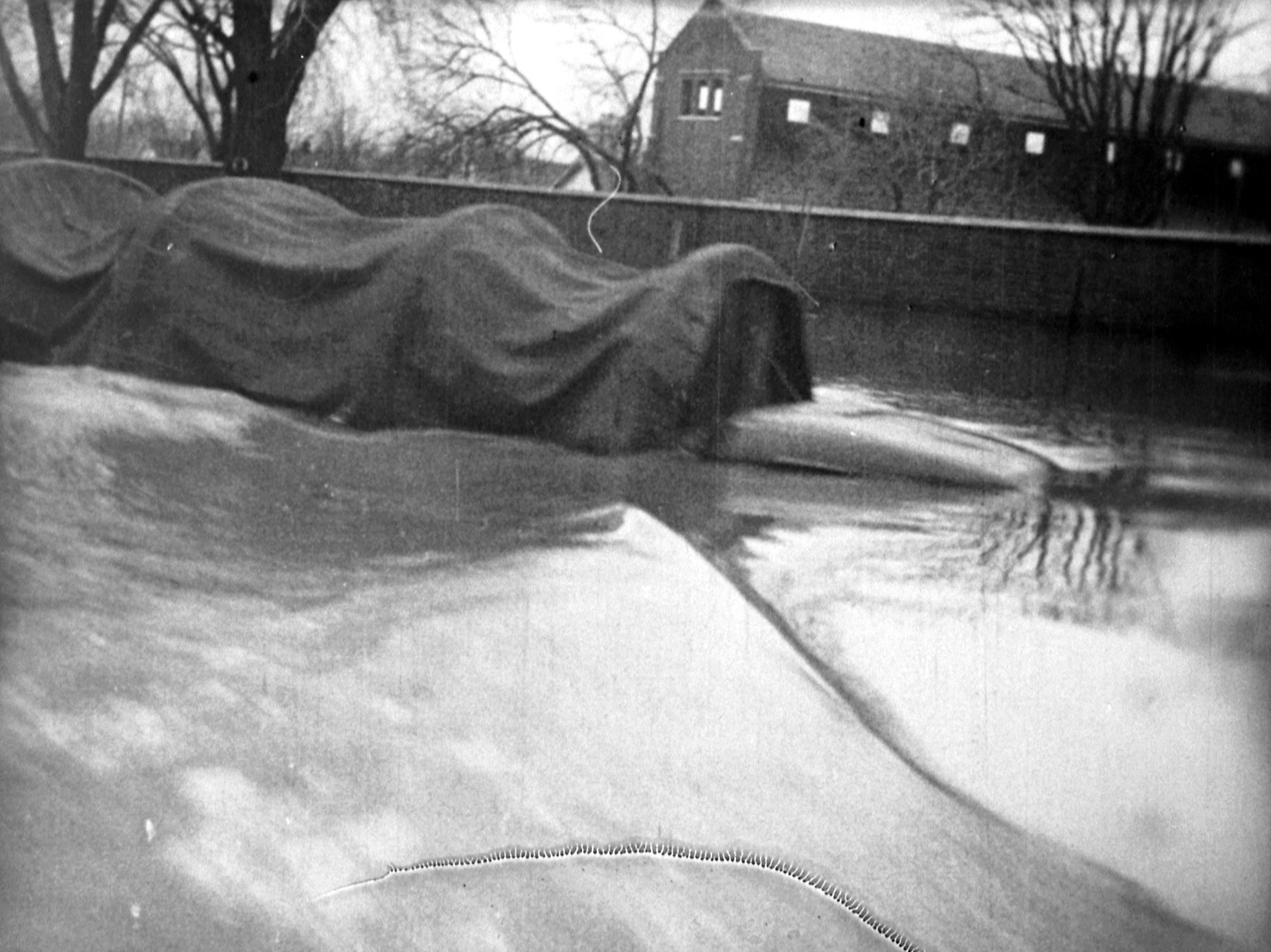 Large truck, flooded almost over hood, on Washington Ave. in front of Enlow Field (grandstand in rear) next to Benjamin Bosse High School, 1300 Washington Ave.