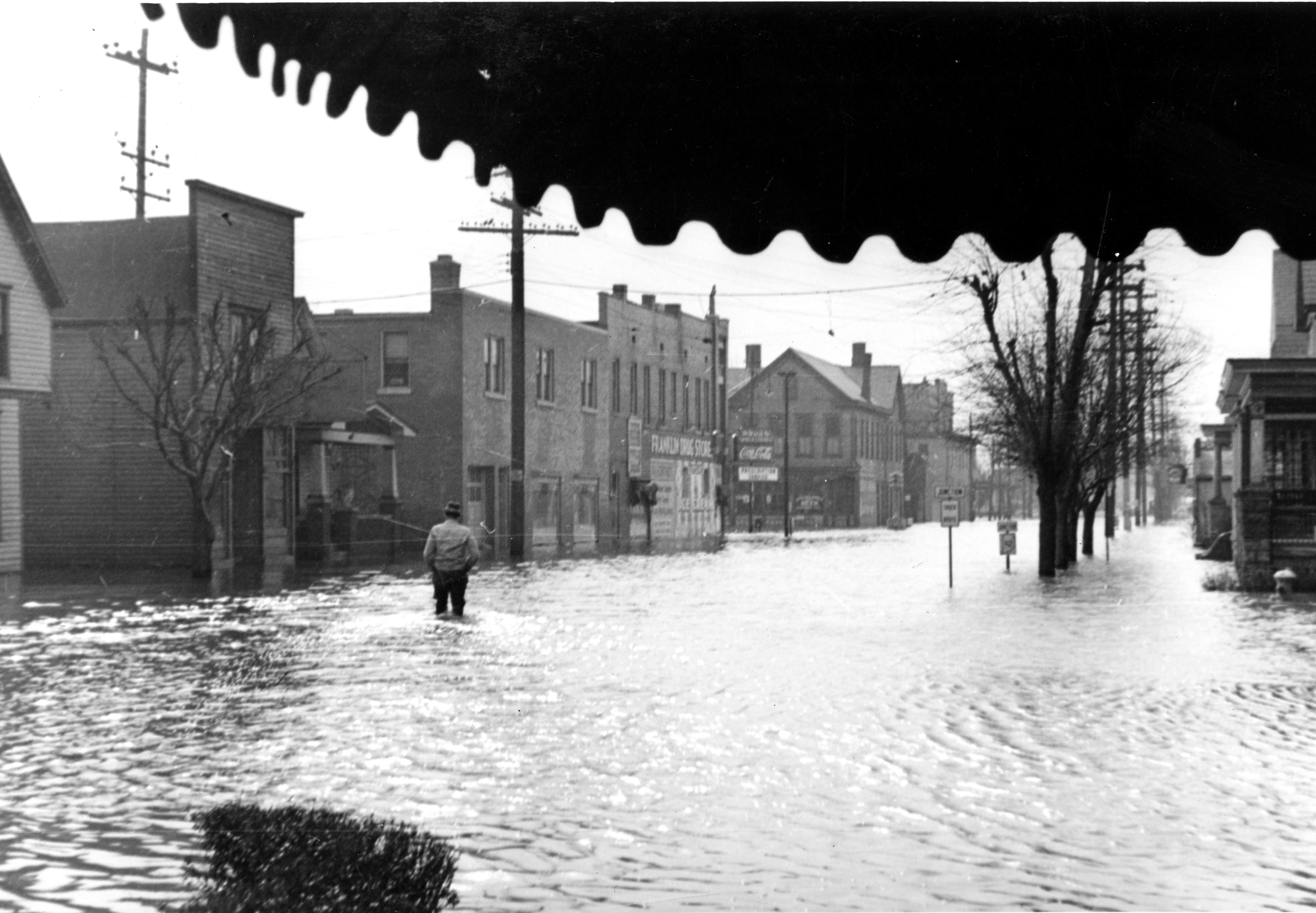 Man standing more than knee deep in flood waters on N. St. Joseph Ave. just past intersection with W. Franklin St. Franklin Drug Store at 2339-41 W. Franklin St. is ahead on his left. Awning in right forefront is for Aug. H. Krohn, jeweler at 400 N. St. Joseph Ave., on corner of W. Michigan St.