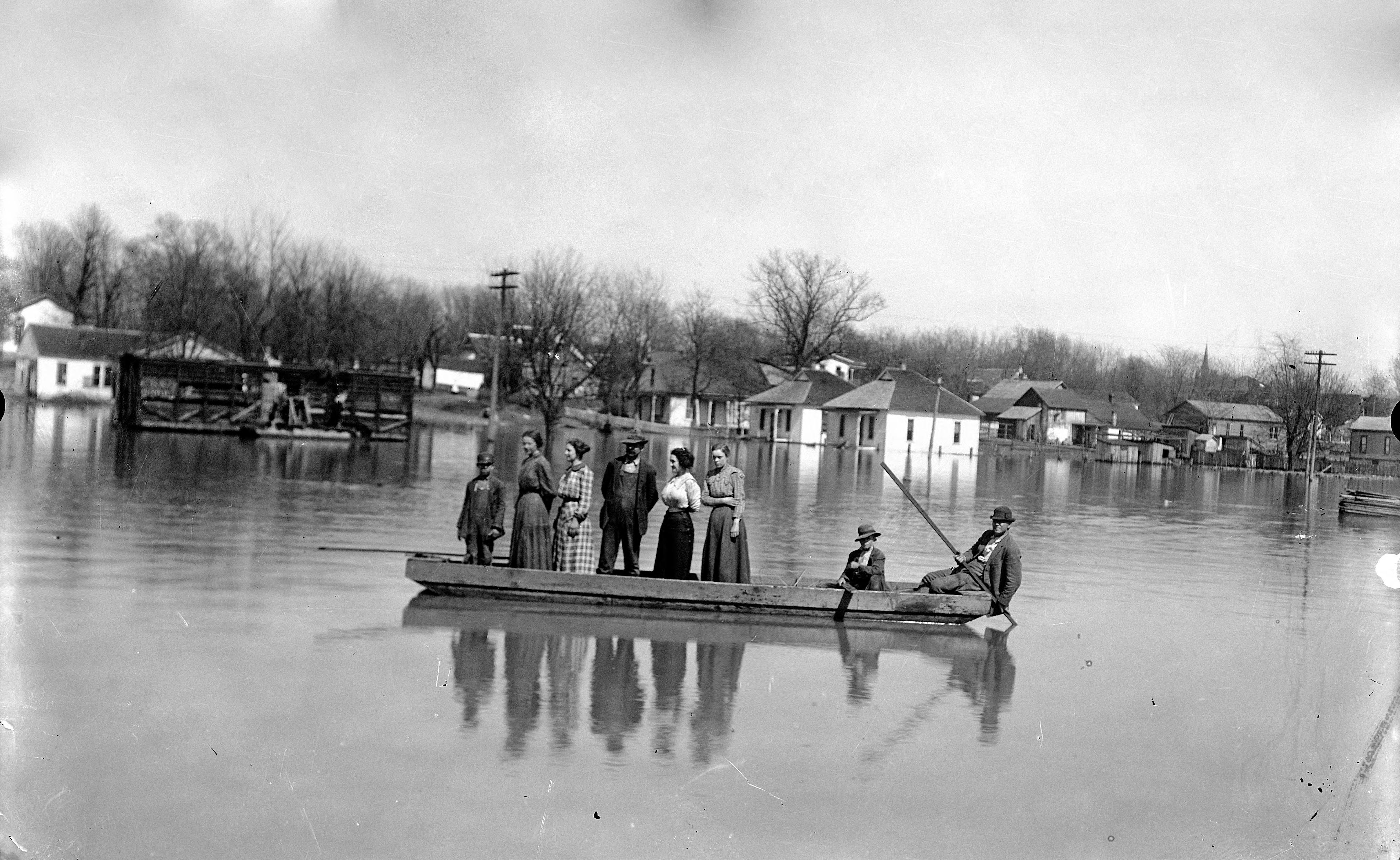 People on boat being poled through flood