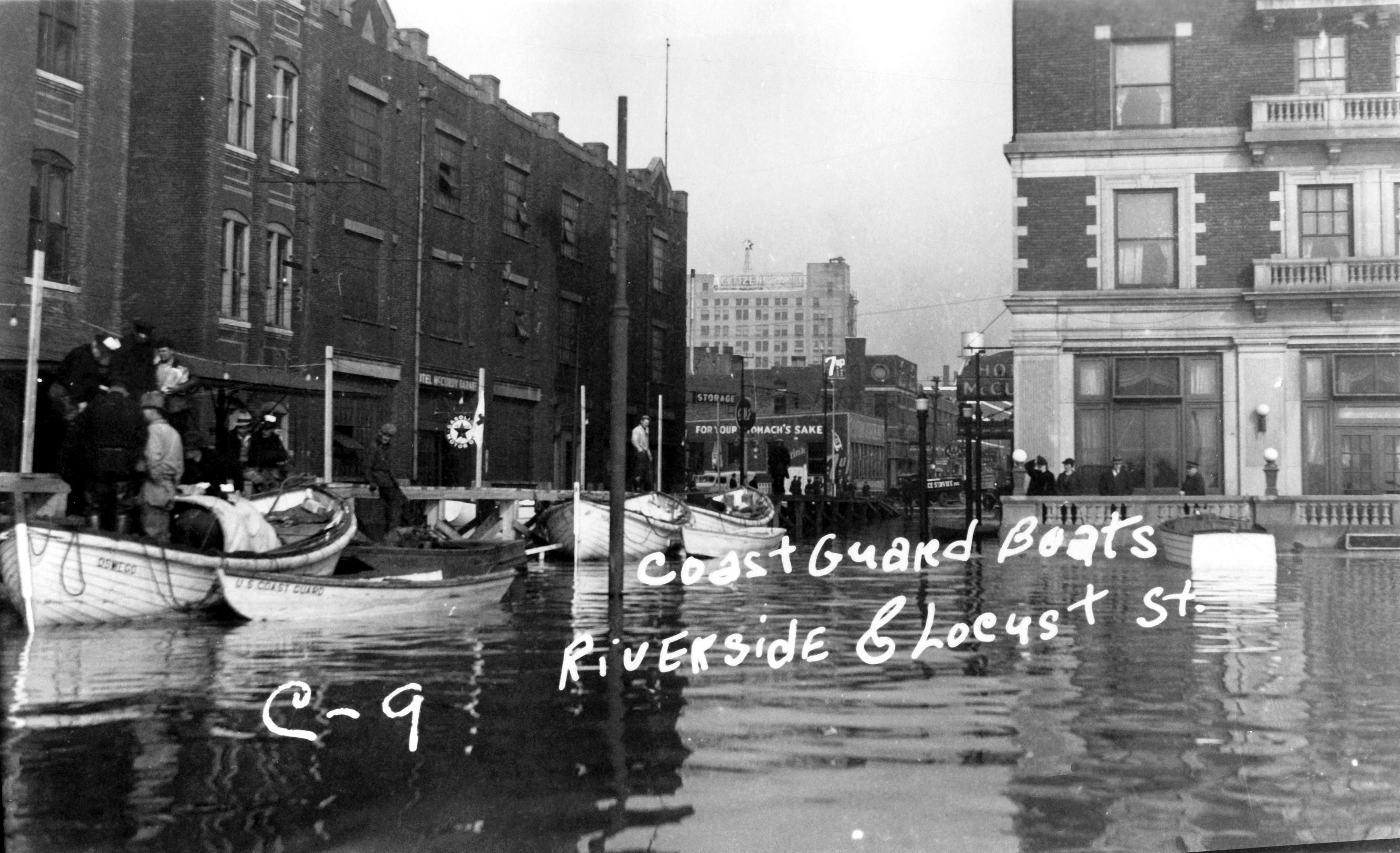 Coast Guard boats tied up at catwalk by Hotel McCurdy garage at 23-25 SE 1st. St. The hotel itself is on the right, at 101-11 SE 1st St. Two men and two women stand on a balcony by the hotel.