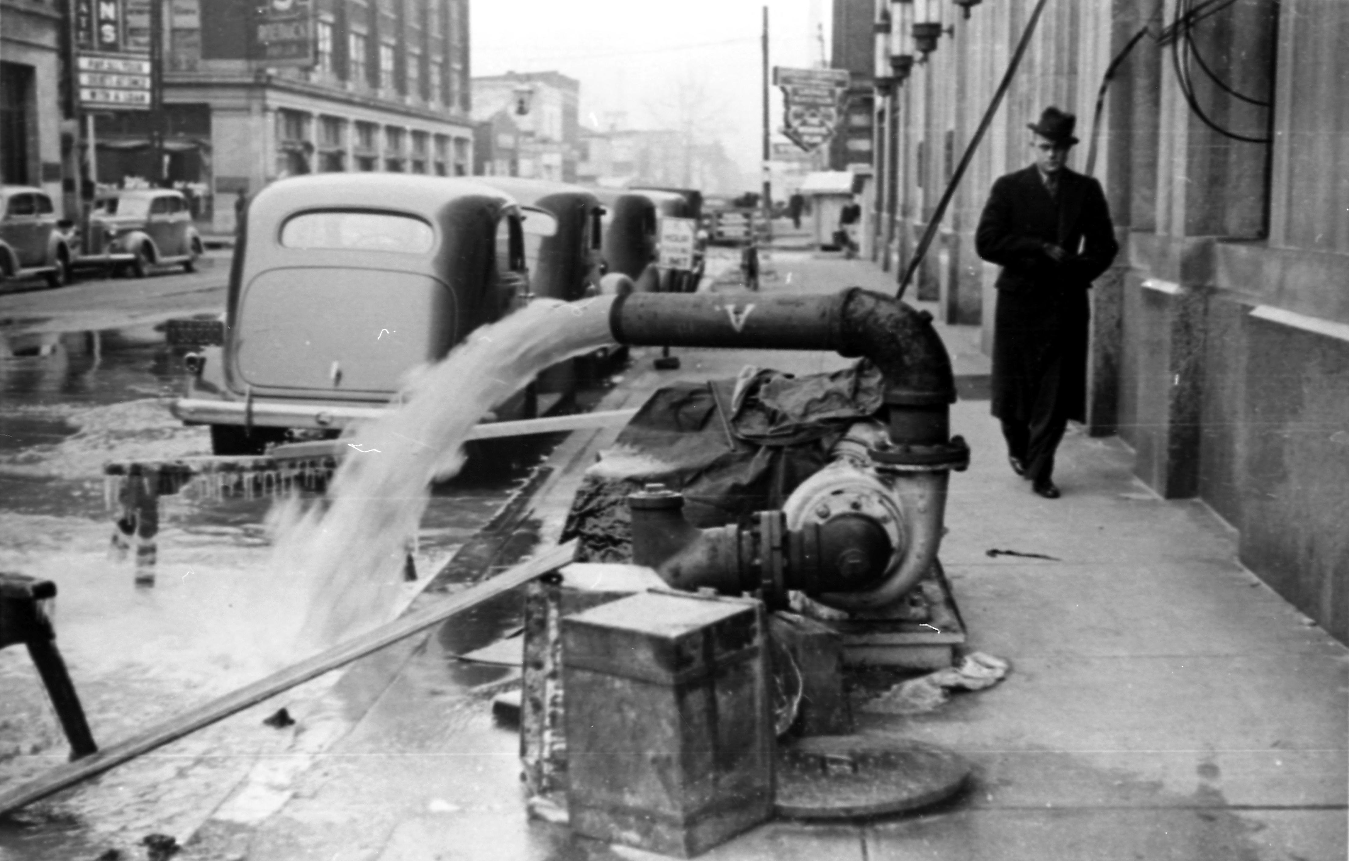 Pumping water from the Hulman (identified as Central Union at that time) Building at corner of NW 4th St. and Sycamore St. This is the Sycamore St. side. Sears & Roebuck at 101 NW 4th St. is at left top.