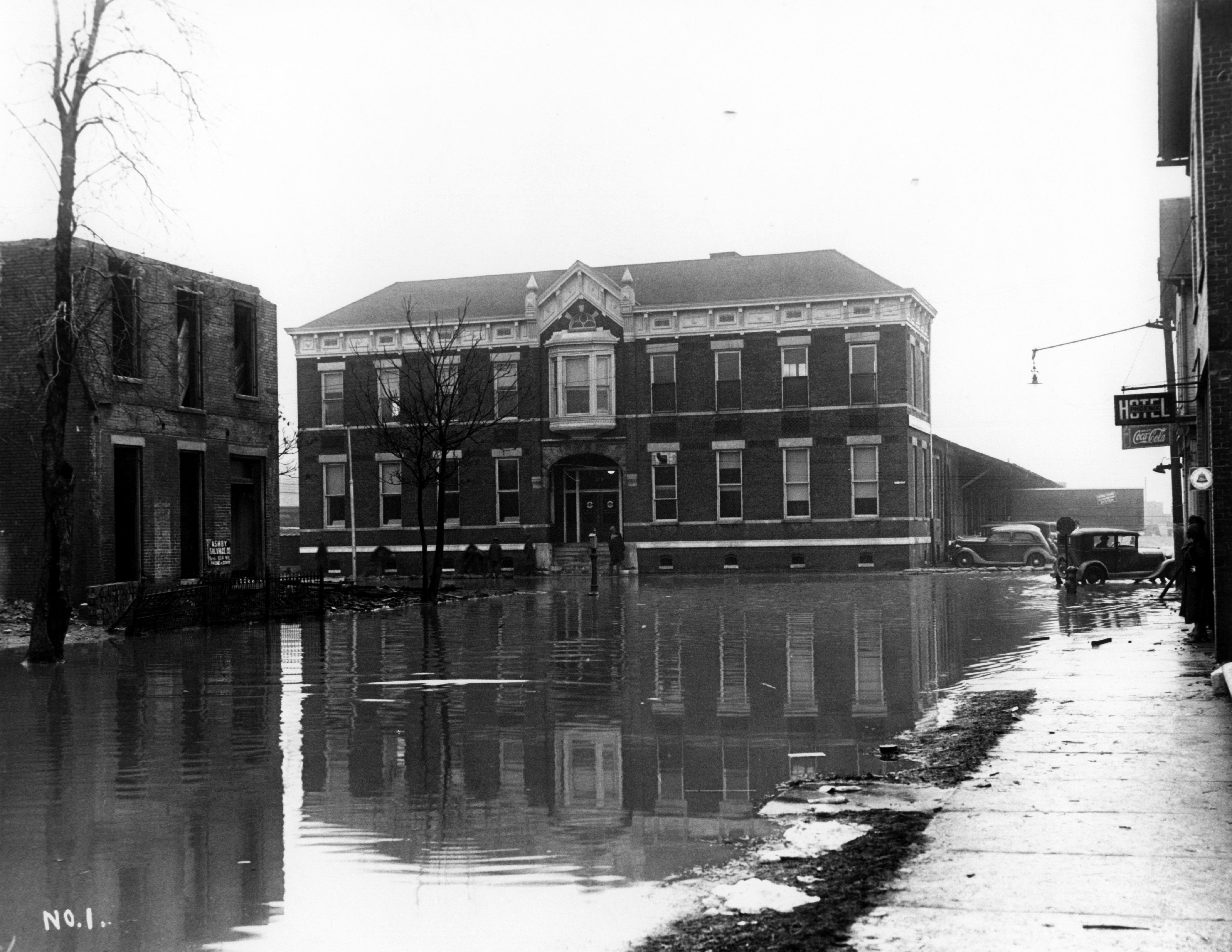 Chicago and Eastern Illinois Railroad freight depot, next to passenger depot (not shown) at 28 SE 8th St. Hotel sign on right, just beyond car on corner, is for the Imperial Hotel (800-02 Main St.) Street is flooded, but not too high.