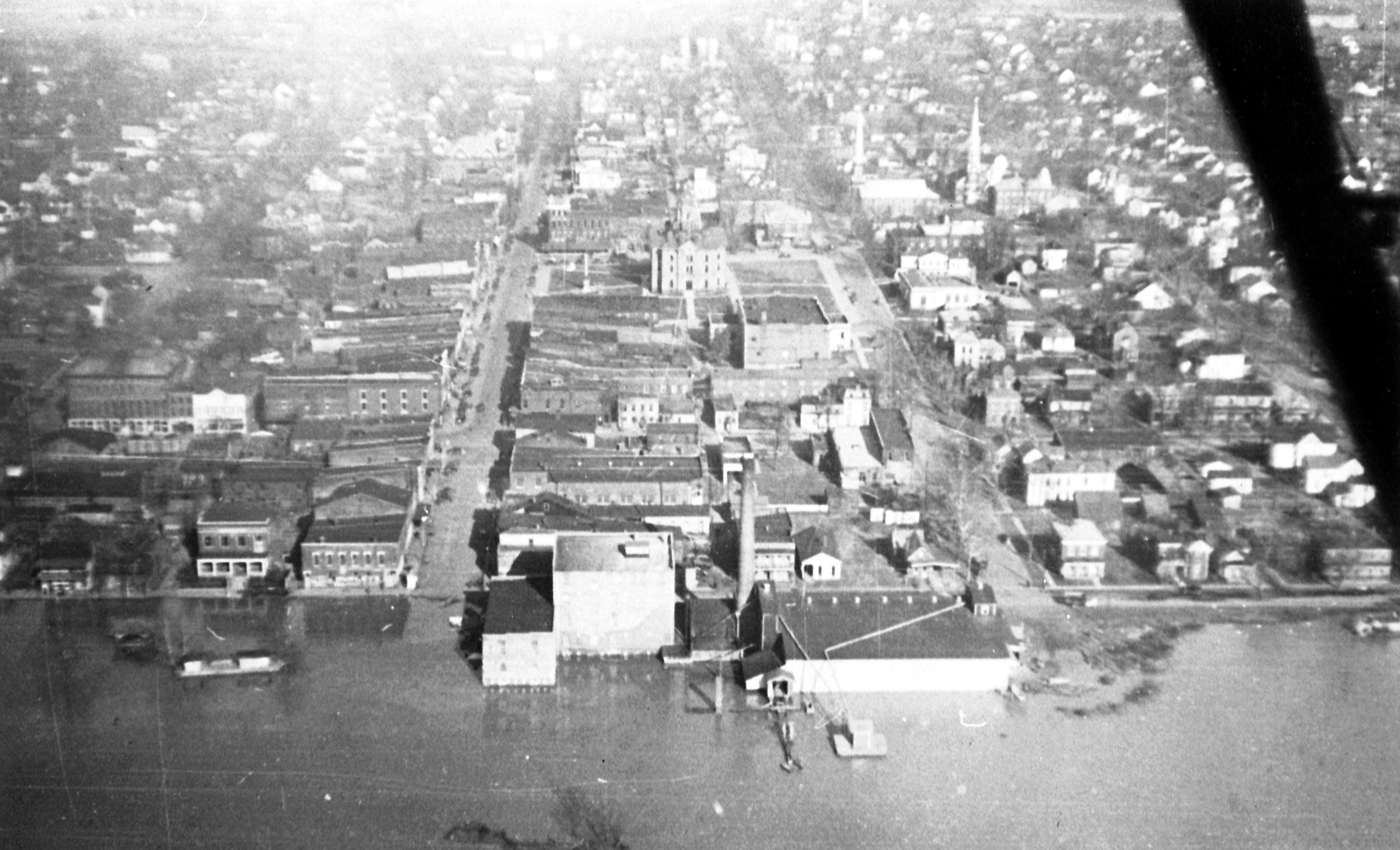 Aerial view of flooded downtown Mt. Vernon, Indiana. Building in center appears to be Posey County court house at 126 E. 3rd St. View is facing town.