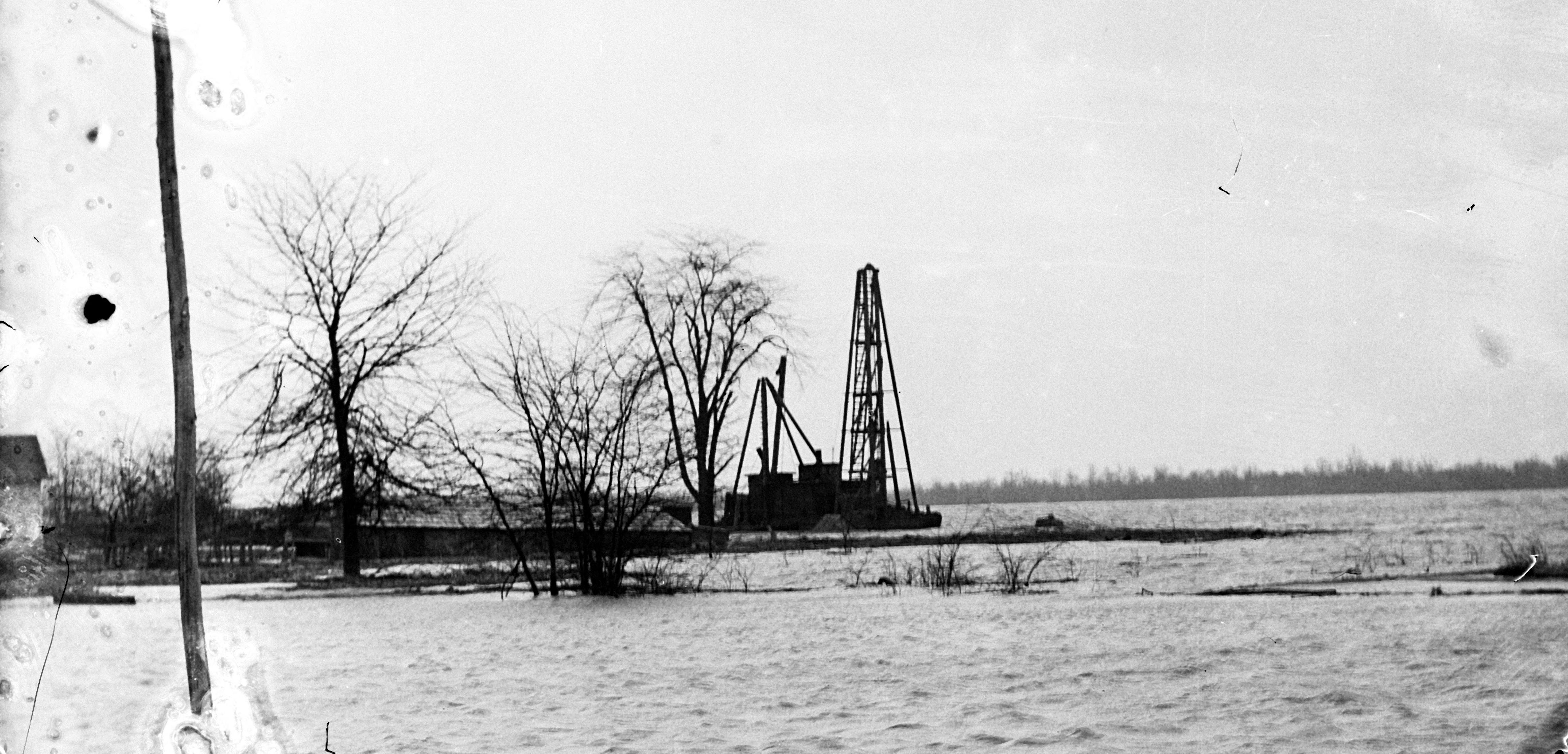 Barge(?) with crane/derrick(?) aboard near flooded property
