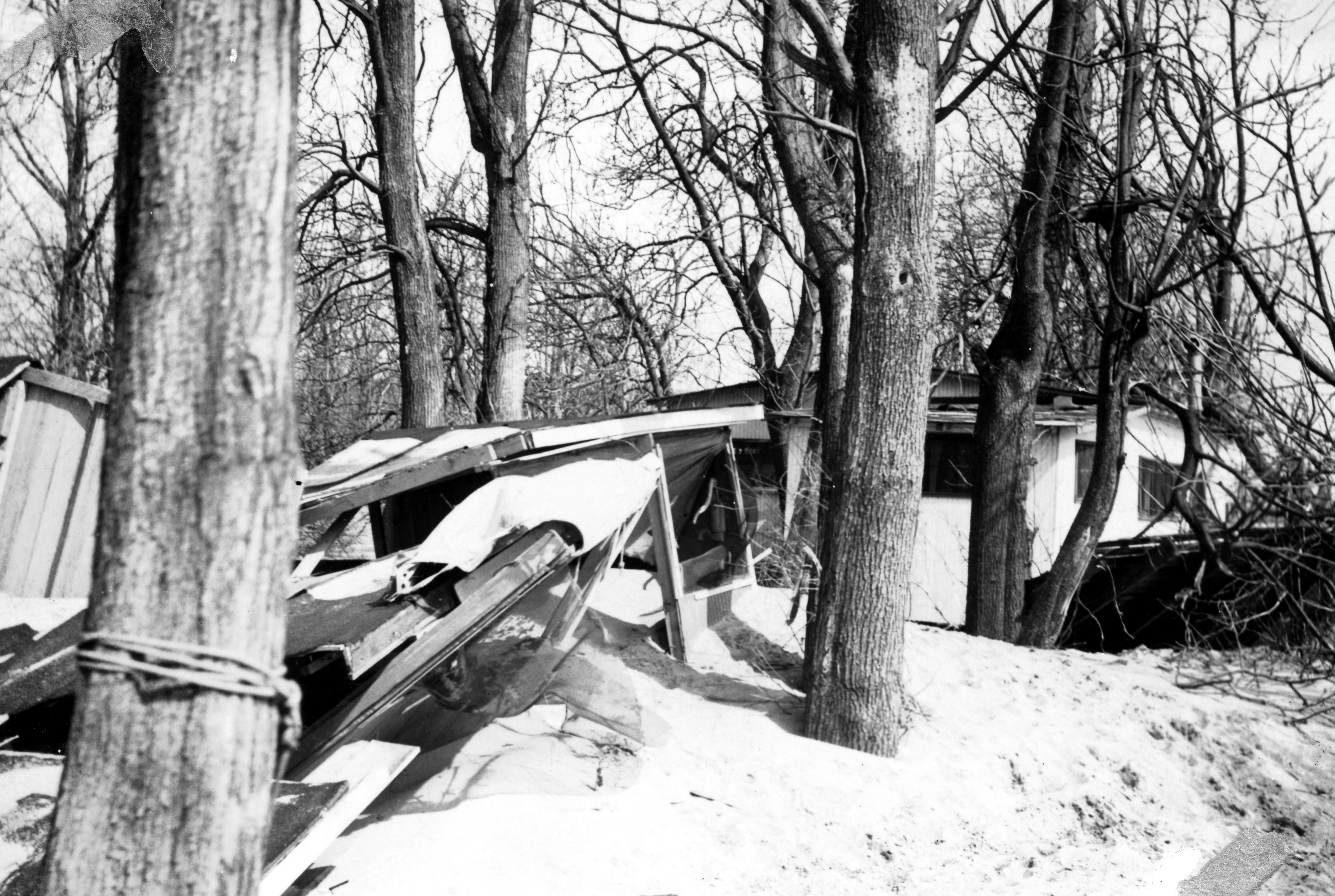 Pieces of a destroyed structure amidst trees and snowy ground. Structure may have been part of the house that is behind it.