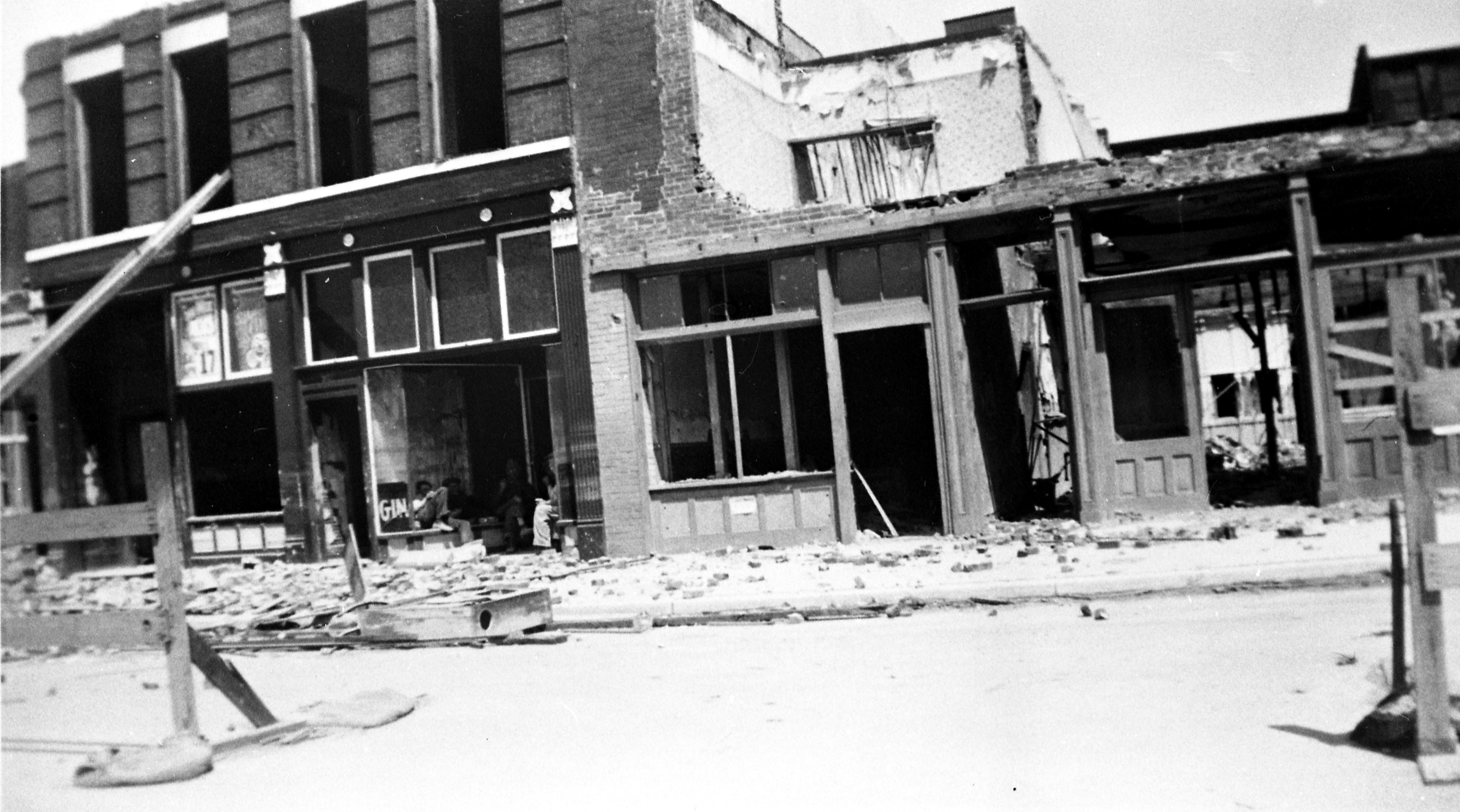 Two severely damaged businesses. Business to left has men sitting in window front that has a gin sign.