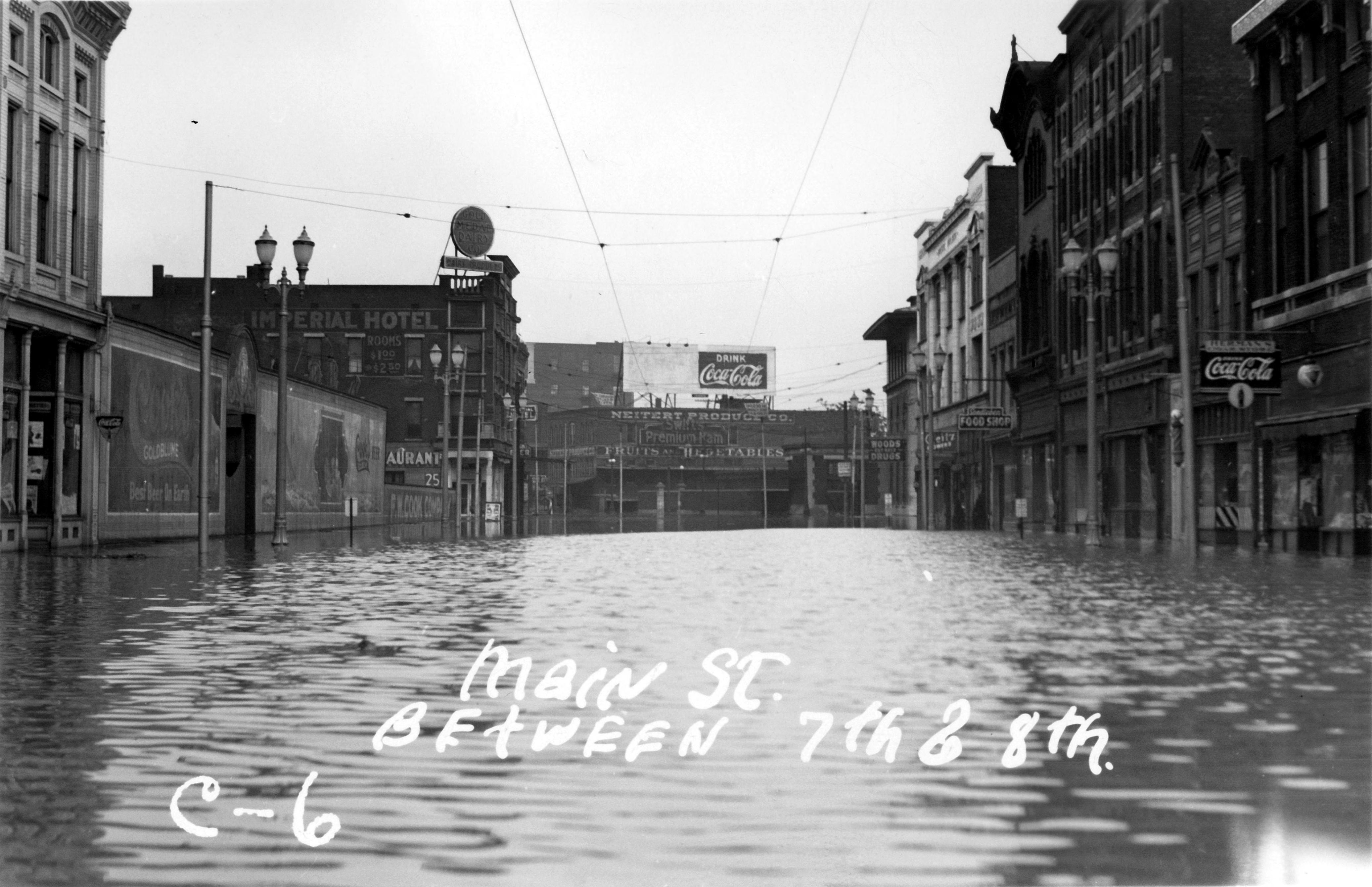 Main St., between 7th and 8th Streets. Imperial Hotel at 800-802 Main St., to left in background. Neitert Produce Co., 815-19 Main St. in rear. On right, from back: H.A. Woods Drug Co. at 729 Main St., Kleitz Flowers Inc. at 721 Main St., Sandleben Food Shop at717 Main St., George W. Herman Cigars at 709 Main St. The round sign atop the hotel advertises Gold Medal Dairy Co. Dairy Products.