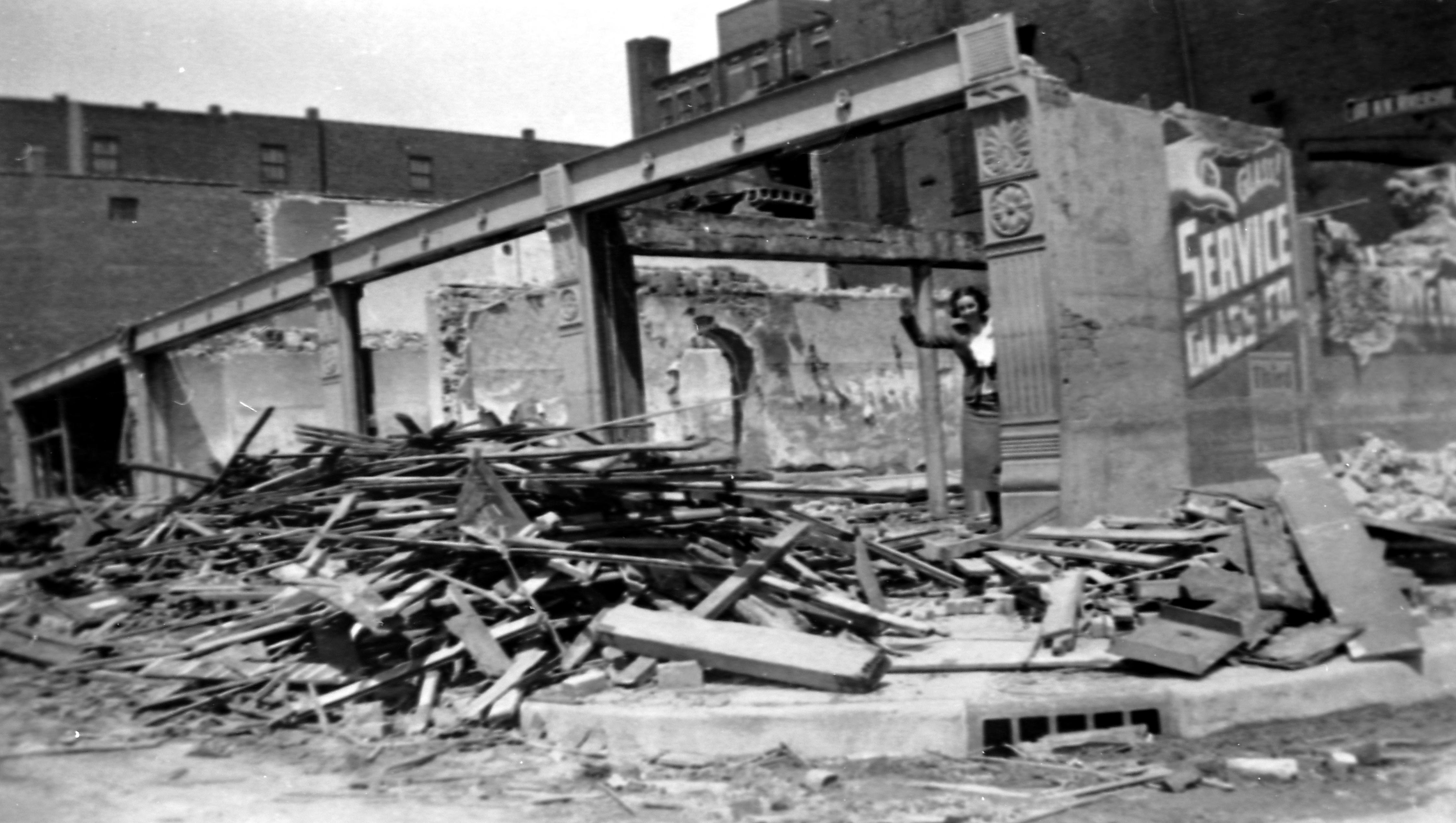 Woman waving from destroyed Service Glass Company at 116 N.W. 3rd St., corner of NW 3rd and Vine