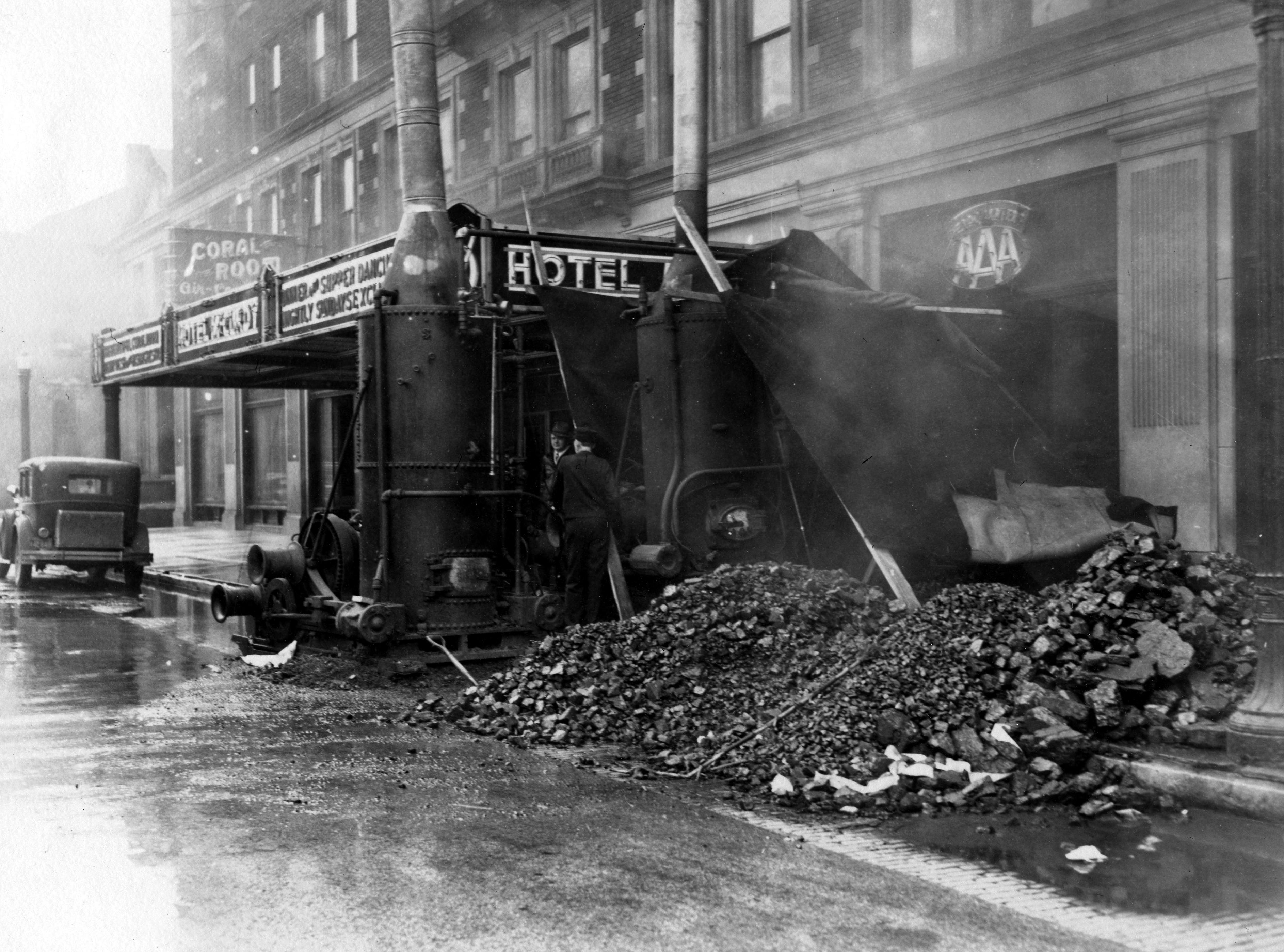Boilers outside Hotel McCurdy at 101-11 SE 1st Street. Pile of coal nearby. Sign for American Automobile Association at 105-07 SE 1st St. visible next to hotel.