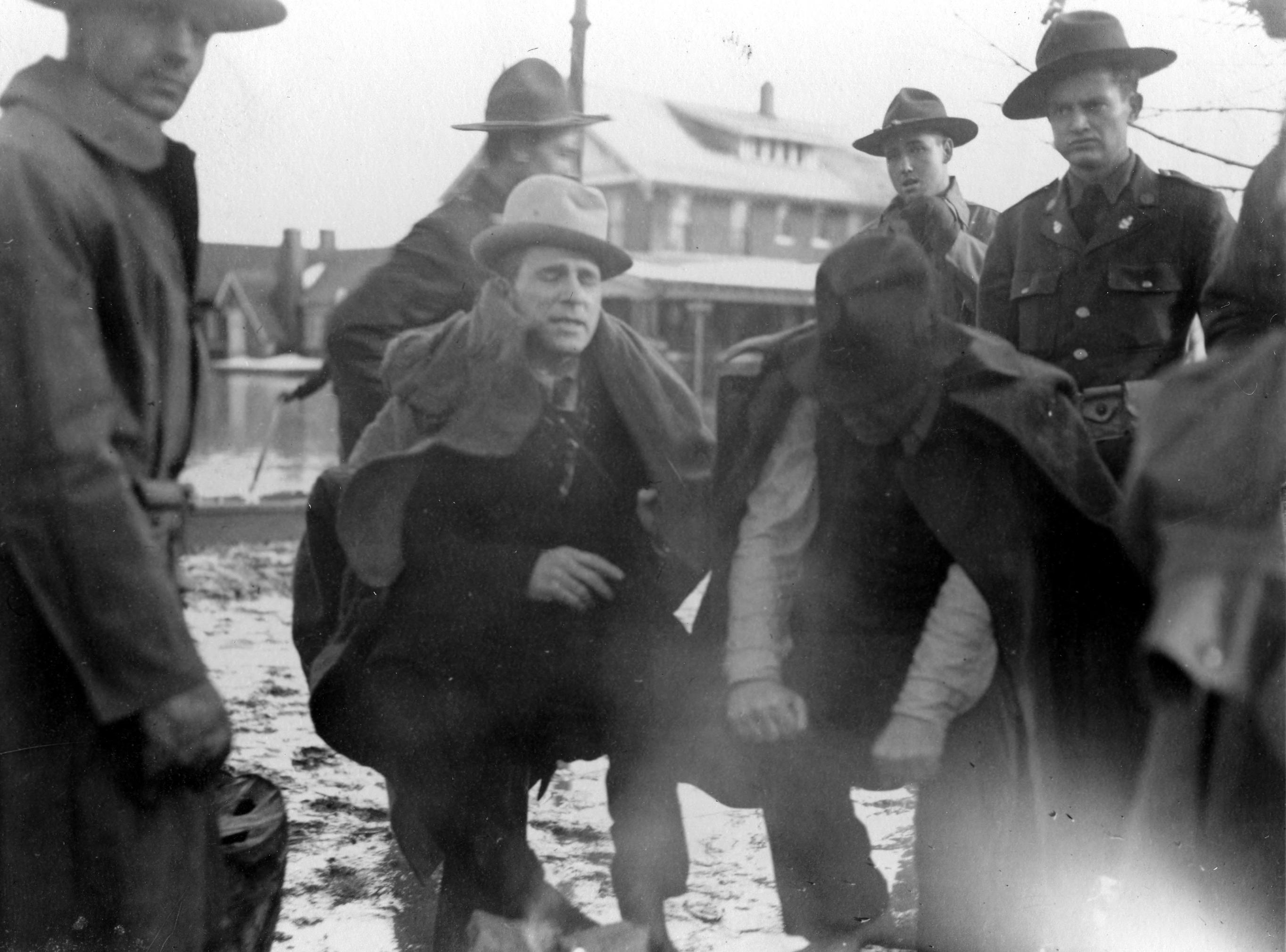Paul H. Schmidt, left, and Philip E. Drachman, warming their hands over a military fire in Bayard Park, with other men standing nearby.