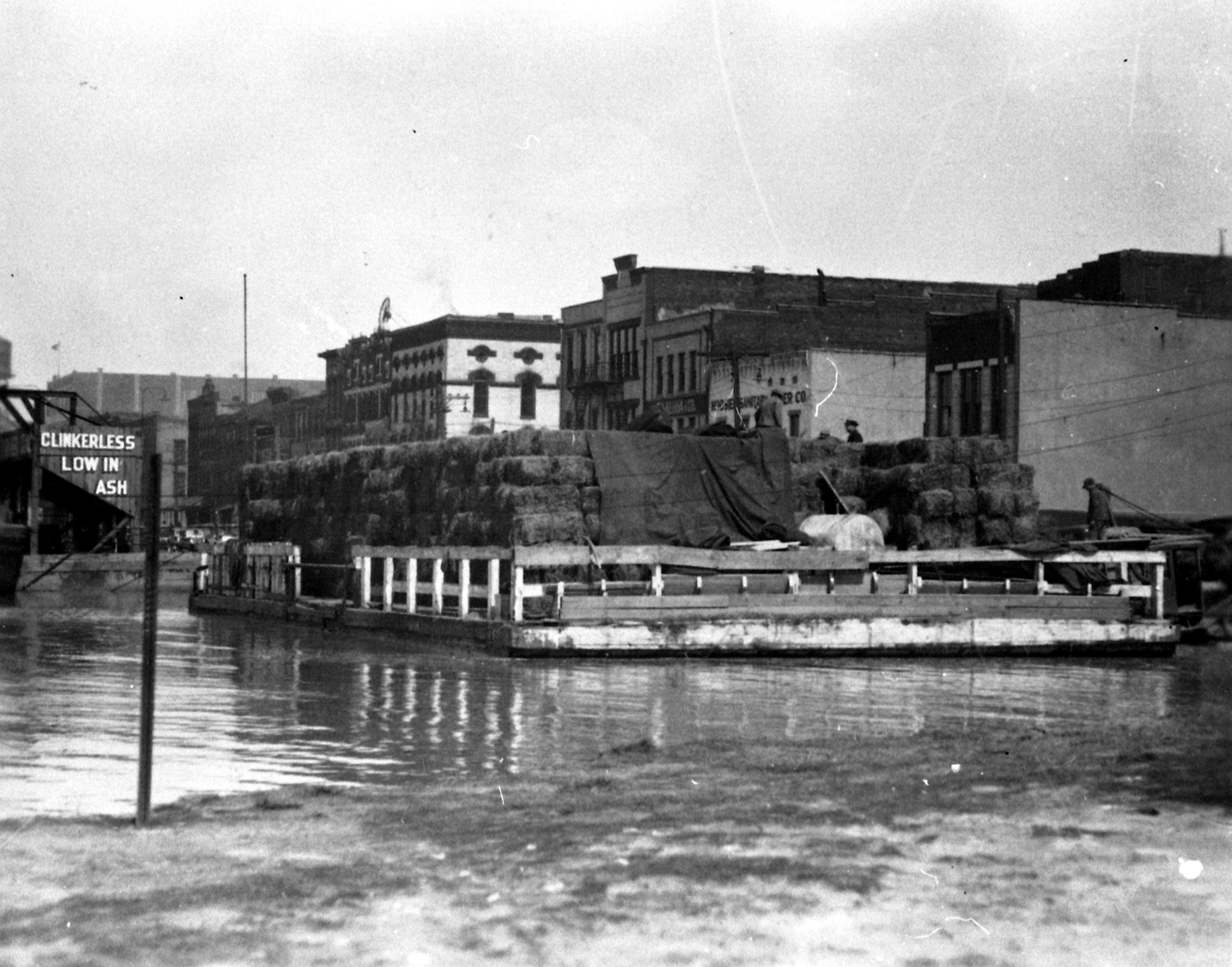 Supply barge, carrying bales of hay, off of SE Riverside Dr. Hoosier Sanitary Wiper Co. at 10-12 SE Riverside Dr. identifiable mid-right, with larger building on left rear probably Keller Crescent Printing & Engraving Co. at 24-28 SE Riverside Dr.