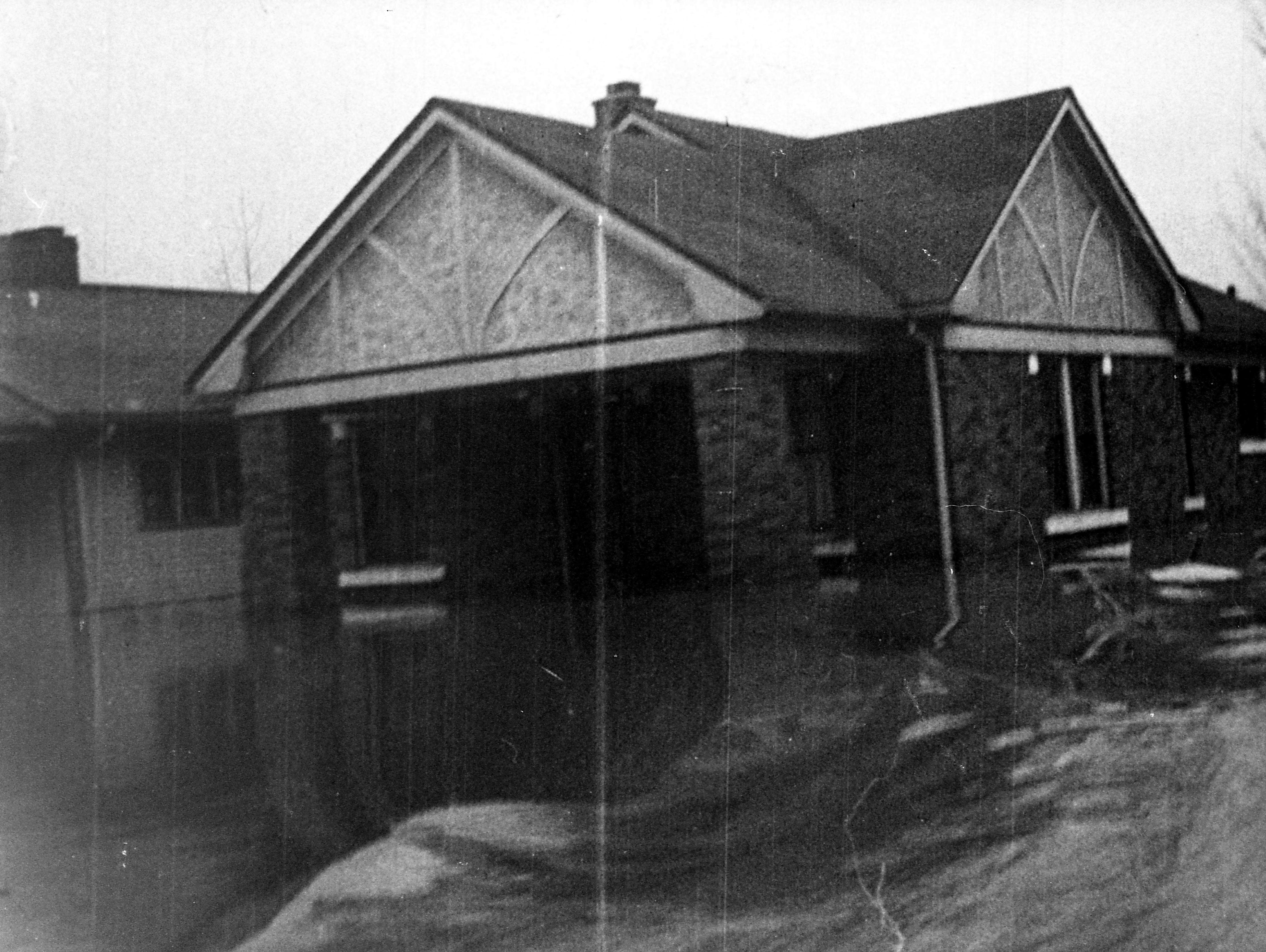 Close-up of large brick house with water over porch. (Same house as 0437)
