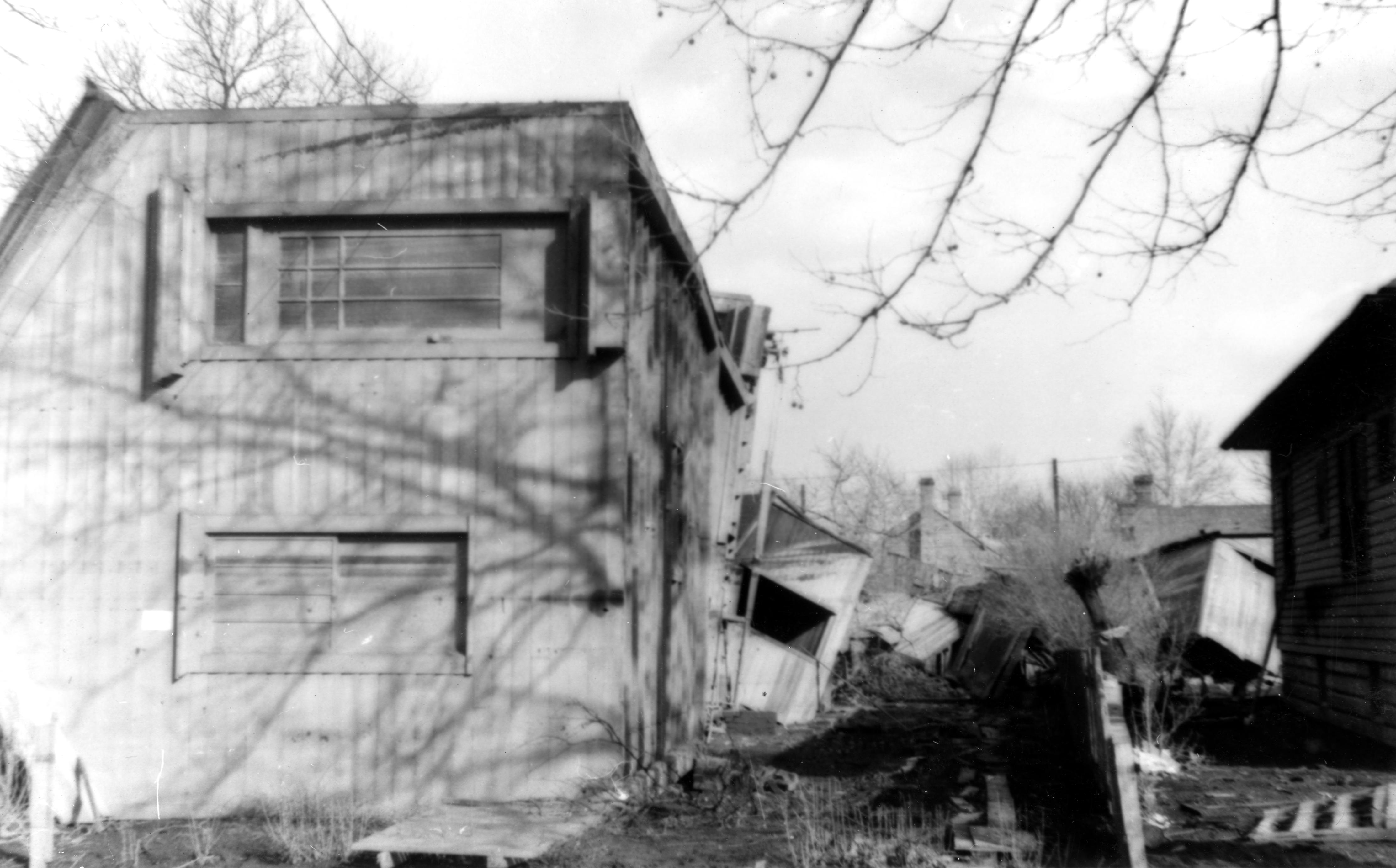 Residence turned on its side by flood, amid other flood damage