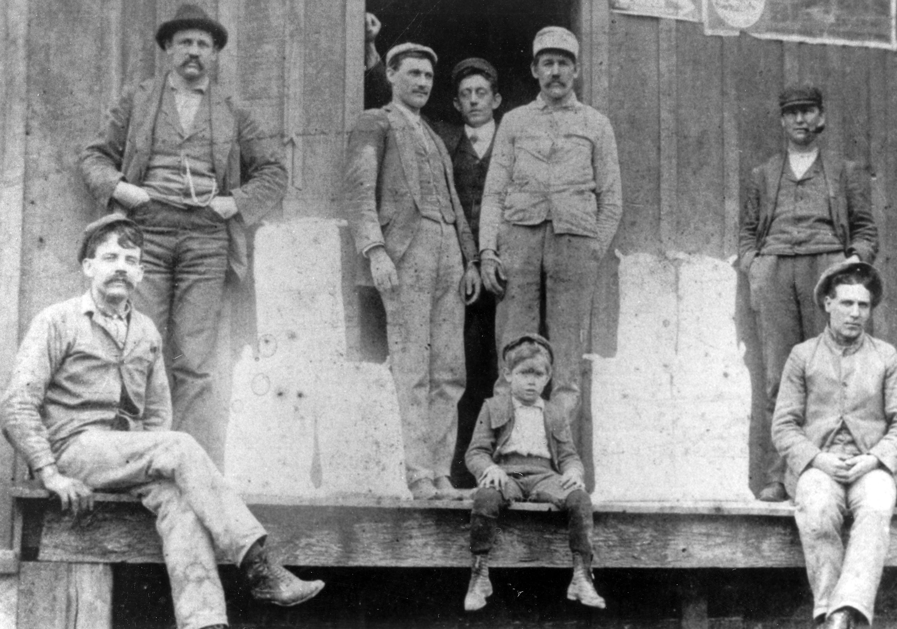 Group of seven men and one child sitting and standing around on a deck outside of a building.